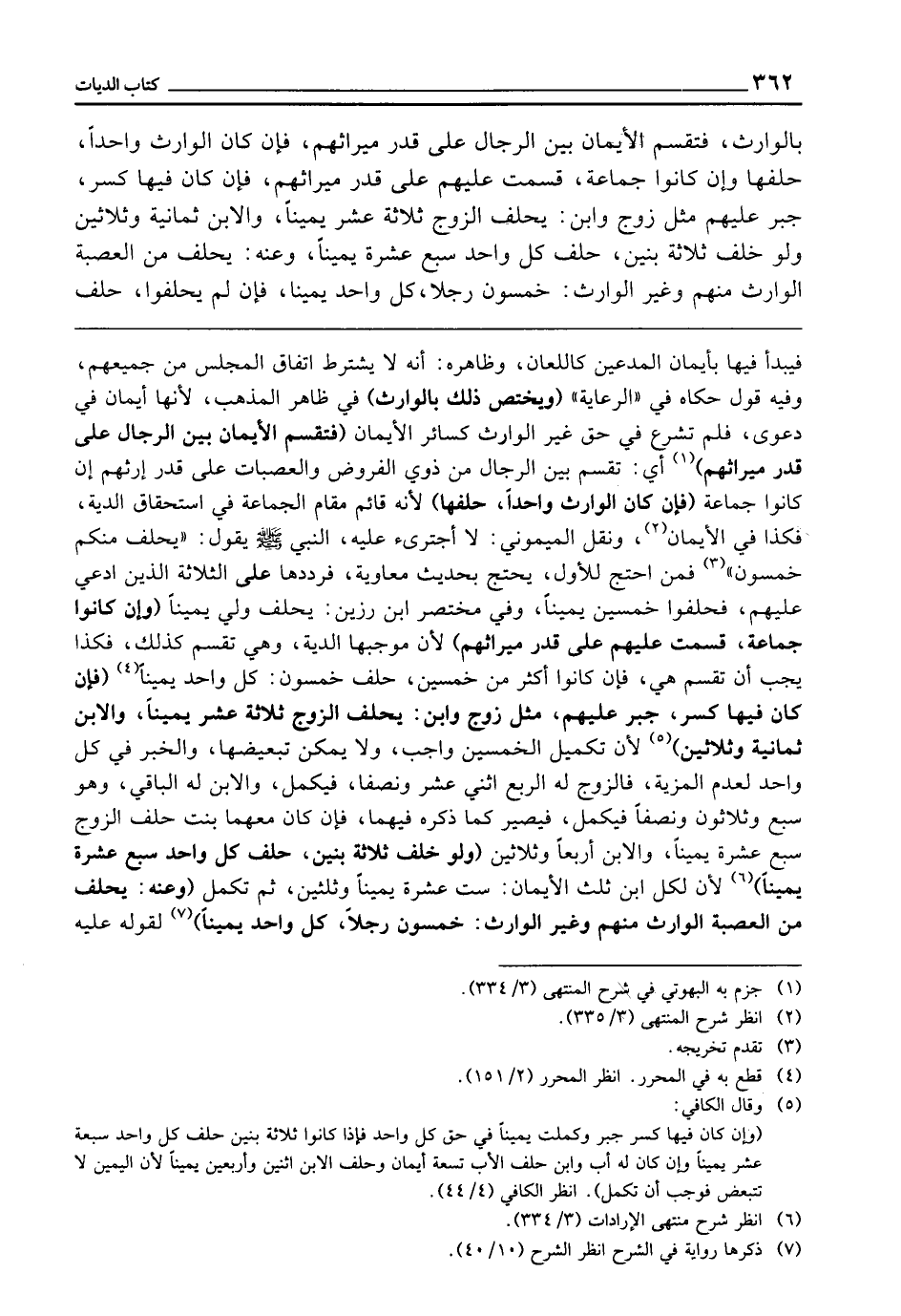 ـــــــــــــــــــــــــــــQفَيُبْدَأُ فِيهَا بِأَيْمَانِ الْمُدَّعِينَ كَاللِّعَانِ، وَظَاهِرُهُ: أَنَّهُ لَا يُشْتَرَطُ اتِّفَاقُ الْمَجْلِسِ مِنْ جَمِيعِهِمْ، وَفِيهِ قَوْلٌ حَكَاهُ فِي الرِّعَايَةِ (وَيَخْتَصُّ ذَلِكَ بِالْوَارِثِ) فِي ظَاهِرِ الْمَذْهَبِ، لِأَنَّهَا أَيْمَانٌ فِي دَعْوَى، فَلَمْ تُشْرَعْ فِي حَقِّ غَيْرِ الْوَارِثِ كَسَائِرِ الْأَيْمَانِ (فَتُقَسَّمُ الْأَيْمَانُ بَيْنَ الرِّجَالِ عَلَى قَدْرِ مِيرَاثِهِمْ) أَيْ: تُقَسَّمُ بَيْنَ الرِّجَالِ مِنْ ذَوِي الْفُرُوضِ وَالْعَصَبَاتِ عَلَى قَدْرِ إِرْثِهِمْ إِنْ كَانُوا جَمَاعَةً (فَإِنْ كَانَ الْوَارِثُ وَاحِدًا حَلَفَهَا) لِأَنَّهُ قَائِمٌ مَقَامَ الْجَمَاعَةِ فِي اسْتِحْقَاقِ الدِّيَةِ، فَكَذَا فِي الْأَيْمَانِ، وَنَقَلَ الْمَيْمُونِيُّ: لَا أَجْتَرِئُ عَلَيْهِ، النَّبِيُّ - صَلَّى اللَّهُ عَلَيْهِ وَسَلَّمَ - يَقُولُ: «يَحْلِفُ مِنْكُمْ خَمْسُونَ» فَمَنِ احْتَجَّ لِلْأَوَّلِ يَحْتَجُّ بِحَدِيثِ مُعَاوِيَةَ، فَرَدَدَهَا عَلَى الثَّلَاثَةِ الَّذِينَ ادُّعِيَ عَلَيْهِمْ، فَحَلَفُوا خَمْسِينَ يَمِينًا، وَفِي مُخْتَصَرِ ابْنِ رَزِينٍ: يَحْلِفُ وَلِيٌّ يَمِينًا (وَإِنْ كَانُوا جَمَاعَةً قُسِّمَتْ عَلَيْهِمْ عَلَى قَدْرِ مِيرَاثِهِمْ) لِأَنَّ مُوجِبَهَا الدِّيَةُ، وَهِيَ تُقَسَّمُ كَذَلِكَ، فَكَذَا يَجِبُ أَنْ تُقَسَّمَ هِيَ، فَإِنْ كَانُوا أَكْثَرَ مِنْ خَمْسِينَ حَلَفَ خَمْسُونَ، كُلُّ وَاحِدٍ يَمِينًا (فَإِنْ كَانَ فِيهَا كَسْرٌ جُبِرَ عَلَيْهِمْ، مِثْلُ زَوْجٍ وَابْنٍ يَحْلِفُ الزَّوْجُ ثَلَاثَةَ عَشَرَ يَمِينًا، وَالِابْنُ ثَمَانِيَةً وَثَلَاثِينَ) لِأَنَّ تَكْمِيلَ الْخَمْسِينَ وَاجِبٌ وَلَا يُمْكِنُ تَبْعِيضُهَا، وَالْخَبَرُ فِي كُلِّ وَاحِدٍ لِعَدَمِ الْمِزْيَةِ، فَالزَّوْجُ لَهُ الرُّبُعُ اثْنَا عَشَرَ وَنِصْفًا فَيُكْمِلُ، وَالِابْنُ لَهُ الْبَاقِي، وَهُوَ سَبْعٌ وَثَلَاثُونَ وَنِصْفًا فَيُكَمَّلُ، فَيَصِيرُ كَمَا ذَكَرَهُ فِيهِمَا، فَإِنْ كَانَ مَعَهُمَا بِنْتٌ حَلَفَ الزَّوْجُ سَبْعَ عَشْرَةَ يَمِينًا، وَالِابْنُ أَرْبَعًا وَثَلَاثِينَ (وَلَوْ خَلَفَ ثَلَاثَةَ بَنِينَ حَلَفَ كُلُّ وَاحِدٍ سَبْعَ عَشْرَةَ يَمِينًا) لِأَنَّ لِكُلِّ ابْنٍ ثُلُثَ الْأَيْمَانِ: سِتَّ عَشْرَةَ يَمِينًا وَثُلُثَيْنِ، ثُمَّ تُكَمَّلُ (وَعَنْهُ: يَحْلِفُ مِنَ الْعَصَبَةِ الْوَارِثُ مِنْهُمْ وَغَيْرُ الْوَارِثِ، خَمْسُونَ رَجُلًا، كُلُّ وَاحِدٍ يَمِينًا) لِقَوْلِهِ عَلَيْهِ