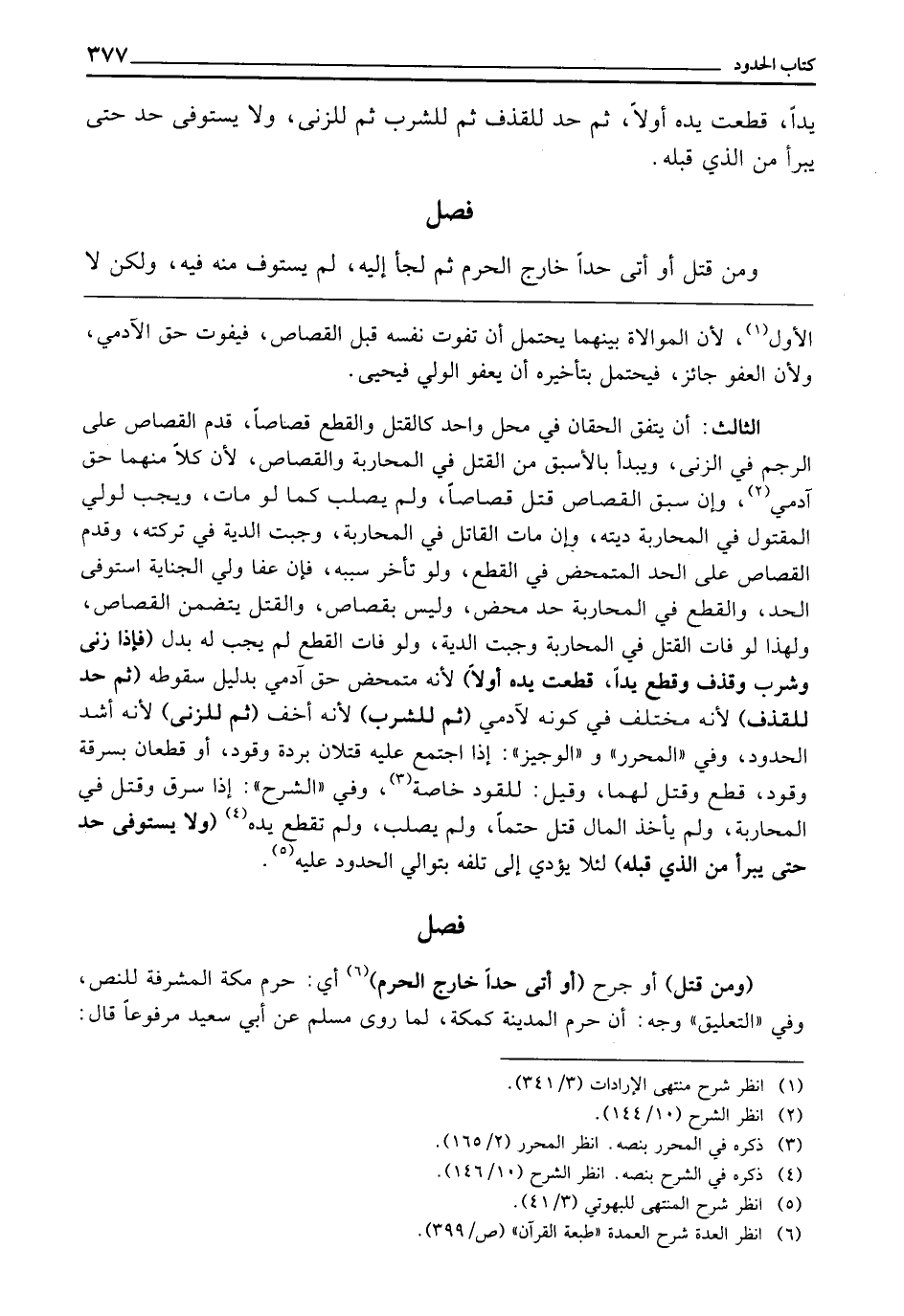 فَصْلٌ (وَمَنْ قَتَلَ) أَوْ جَرَحَ (أَوْ أَتَى حَدًّا خَارِجَ الْحَرَمِ) أَيْ: حَرَمِ مَكَّةَ الْمُشَرَّفَةِ لِلنَّصِّ، وَفِي التَّعْلِيقِ وَجْهٌ: أَنَّ حَرَمَ الْمَدِينَةِ كَمَكَّةَ، لِمَا رَوَى مُسْلِمٌ عَنْ أَبِي سَعِيدٍ مَرْفُوعًا، قَالَ:
