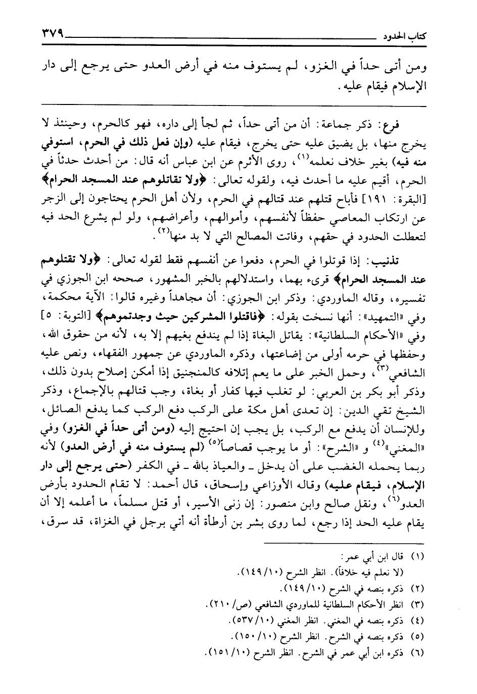 وَمَنْ أَتَى حَدًّا فِي الْغَزْوِ لَمْ يُسْتَوْفَ مِنْهُ فِي أَرْضِ الْعَدُوِّ حَتَّى يَرْجِعَ إِلَى دَارِ الْإِسْلَامِ، فَيُقَامَ عَلَيْهِ.