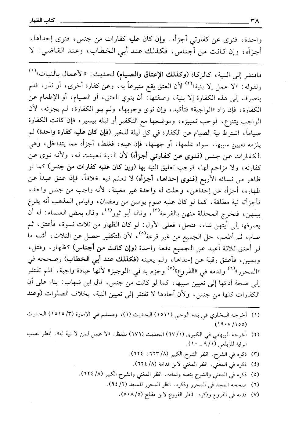 ـــــــــــــــــــــــــــــQفَافْتَقَرَ إِلَى النِّيَّةِ كَالزَّكَاةِ، (وَكَذَلِكَ الْإِعْتَاقُ، وَالصِّيَامُ) لِحَدِيثِ «الْأَعْمَالُ بِالنِّيَّاتِ» وَلِقَوْلِهِ «لَا عَمَلَ إِلَّا بِنِيَّةٍ» لِأَنَّ الْعِتْقَ يَقَعُ مُتَبَرِّعًا بِهِ. وَعَنْ كَفَّارَةٍ أُخْرَى، أَوْ نَذْرٍ، فَلَمْ يَنْصَرِفْ إِلَى هَذِهِ الْكَفَّارَةِ إِلَّا بِنِيَّةٍ. وَصَفَتُهَا أَنْ يَنْوِيَ الْعِتْقَ، أَوِ الصِّيَامَ، أَوِ الْإِطْعَامَ عَنِ الْكَفَّارَةِ، فَإِنْ زَادَ " الْوَاجِبَةَ " فَتَأْكِيدٌ، وَإِنْ نَوَى وُجُوبَهَا وَلَمْ يَنْوِ الْكَفَّارَةَ، لَمْ يُجْزِئْهُ ; لِأَنَّ الْوَاجِبَ يَتَنَوَّعُ فَوَجَبَ تَمْيِيزُهُ. وَمَوْضِعُهَا مَعَ التَّكْفِيرِ أَوْ قَبْلَهُ بِيَسِيرٍ، فَإِنْ كَانَتِ الْكَفَّارَةُ صِيَامًا اشْتَرَطَ نِيَّةَ الصِّيَامِ عَنِ الْكَفَّارَةِ فِي كُلِّ لَيْلَةٍ لِلْخَبَرِ. (فَإِنْ كَانَ عَلَيْهِ كَفَارَّةٌ وَاحِدَةٌ) لَمْ يَلْزَمْهُ تَعْيِينُ سَبَبِهَا سَوَاءٌ عَلِمَهَا أَوْ جَهِلَهَا، فَإِنْ عَيَّنَهُ فَغَلِطَ أَجْزَأَهُ عَمَّا يَتَدَاخَلُ، وَهِيَ الْكَفَّارَاتُ عَنْ جِنْسٍ، (فَنَوَى عَنْ كَفَارَتِي أَجْزَأَهُ) لِأَنَّ النِّيَّةَ تَعَيَّنَتْ لَهُ، وَلِأَنَّهُ نَوَى عَنْ كَفَّارَتِهِ، وَلَا مُزَاحِمَ لَهَا فَوَجَبَ تَعْلِيقُ النِّيَّةِ بِهَا. (وَإِنْ كَانَ عَلَيْهِ كَفَّارَاتٌ مِنْ جِنْسٍ) كَمَا لَوْ ظَاهَرَ مِنْ نِسَائِهِ الْأَرْبَعِ (فَنَوَى إِحْدَاهَا أَجْزَأَهُ) لَا نَعْلَمُ فِيهِ خِلَافًا، فَإِذَا عَتَقَ عَبْدًا عَنْ ظِهَارِهِ أَجْزَأَهُ عَنْ إِحْدَاهُنَّ وَحَلَّتْ لَهُ وَاحِدَةٌ غَيْرُ مُعَيَّنَةٍ ; لِأَنَّهُ وَاجِبٌ مِنْ جِنْسٍ وَاحِدٍ، فَأَجْزَأَتْهُ نِيَّةٌ مُطْلَقَةٌ كَمَا لَوْ كَانَ عَلَيْهِ صَوْمُ يَوْمَيْنِ مِنْ رَمَضَانَ. وَقِيَاسُ الْمَذْهَبِ أَنَّهُ يُقْرِعُ بَيْنَهُنَّ، فَتَخْرُجُ الْمُحَلِّلَةُ مِنْهُنَّ بِالْقُرْعَةِ. وَقَالَهُ أَبُو ثَوْرٍ، وَقَالَ بَعْضُ الْعُلَمَاءِ: لَهُ أَنْ يَصْرِفَهَا إِلَى أَيَّتِهِنَّ شَاءَ فَتَحِلُّ، فَعَلَى الْأَوَّلِ لَوْ كَانَ الظِّهَارُ مِنْ ثَلَاثِ نِسْوَةٍ فَأَعْتَقَ، ثُمَّ صَامَ، ثُمَّ أَطْعَمَ حَلَّ الْجَمِيعُ مِنْ غَيْرِ قَرْعَةٍ ; لِأَنَّ التَّكْفِيرَ حَصَلَ عَنِ الثَّلَاثِ أَشْبَهَ مَا لَوْ أَعْتَقَ ثَلَاثَةَ أَعْبُدٍ عَنِ الْجَمِيعِ دَفْعَةً وَاحِدَةً. (وَإِنْ كَانَتْ مِنْ أَجْنَاسٍ) كَظِهَارٍ، وَقَتْلٍ، وَيَمِينٍ، فَأَعْتَقَ رَقَبَةً عَنْ إِحْدَاهَا، وَلَمْ يُعَيِّنْهُ (فَكَذَلِكَ عِنْدَ أَبِي الْخَطَّابِ) . وَصَحَّحَهُ فِي " الْمُحَرَّرِ "، وَقَدَّمَهُ فِي " الْفُرُوعِ " وَجَزَمَ بِهِ فِي " الْوَجِيزِ " ; لِأَنَّهَا عِبَادَةٌ وَاجِبَةٌ، فَلَمْ تَفْتَقِرْ إِلَى صِحَّةِ أَدَائِهَا إِلَى تَعْيِينِ سَبَبِهَا كَمَا لَوْ كَانَتْ مِنْ جِنْسٍ. قَالَ ابْنُ شِهَابٍ: بِنَاءً عَلَى أَنَّ الْكَفَّارَاتِ كُلِّهَا مِنْ جِنْسٍ، وَلِأَنَّ آحَادَهَا لَا تَفْتَقِرُ إِلَى تَعْيِينِ النِّيَّةِ، بِخِلَافِ الصَّلَوَاتِ.