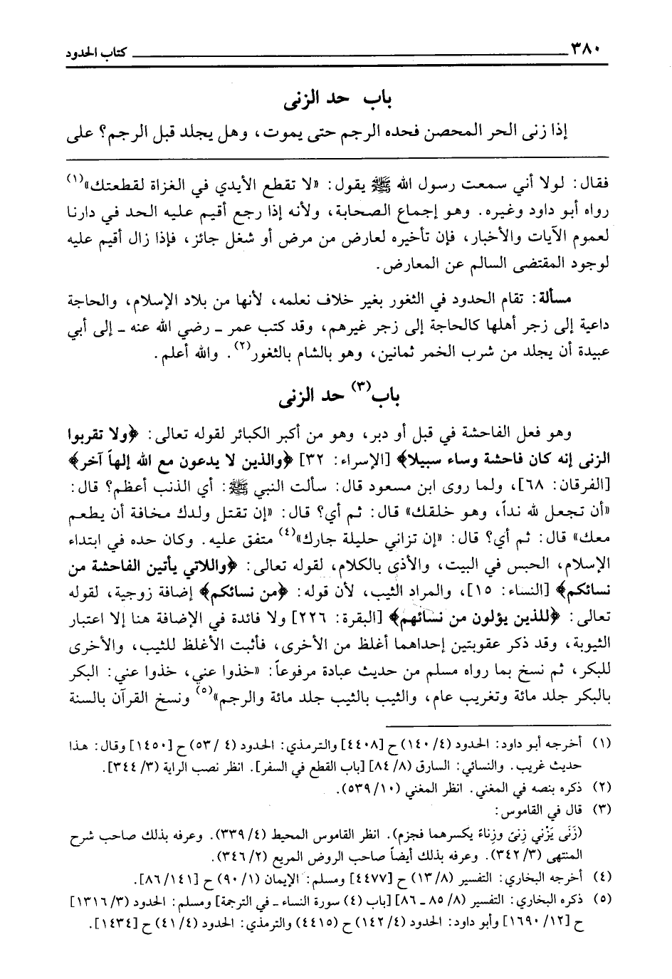 بَابُ حَدِّ الزِّنَا وَهُوَ: فِعْلُ الْفَاحِشَةِ فِي قُبُلٍ أَوْ دُبُرٍ، وَهُوَ مِنْ أَكْبَرِ الْكَبَائِرِ، لِقَوْلِهِ تَعَالَى: {وَلا تَقْرَبُوا الزِّنَا إِنَّهُ كَانَ فَاحِشَةً وَسَاءَ سَبِيلا} [الإسراء: 32] {وَالَّذِينَ لا يَدْعُونَ مَعَ اللَّهِ إِلَهًا آخَرَ} [الفرقان: 68] وَلِمَا «رَوَى ابْنُ مَسْعُودٍ، قَالَ: سَأَلْتُ النَّبِيَّ - صَلَّى اللَّهُ عَلَيْهِ وَسَلَّمَ -: أَيُّ الذَّنْبِ أَعْظَمُ؟ قَالَ: أَنْ تَجْعَلَ لِلَّهِ نِدًّا وَهُوَ خَلَقَكَ، قَالَ: ثُمَّ أَيُّ؟ قَالَ: أَنْ تَقْتُلَ وَلَدَكَ مَخَافَةَ أَنْ يَطْعَمَ مَعَكَ، قَالَ: ثُمَّ أَيُّ؟ قَالَ: أَنْ تُزَانِيَ حَلِيلَةَ جَارِكَ» . مُتَّفَقٌ عَلَيْهِ، وَكَانَ حَدُّهُ فِي ابْتِدَاءِ الْإِسْلَامِ الْحَبْسَ فِي الْبَيْتِ وَالْأَذَى بِالْكَلَامِ، لِقَوْلِهِ تَعَالَى: {وَاللاتِي يَأْتِينَ الْفَاحِشَةَ مِنْ نِسَائِكُمْ} [النساء: 15] وَالْمُرَادُ الثَّيِّبُ، لِأَنَّ قَوْلَهُ: مِنْ نِسَائِكُمْ إِضَافَةُ زَوْجِيَّةٍ لِقَوْلِهِ تَعَالَى: {لِلَّذِينَ يُؤْلُونَ مِنْ نِسَائِهِمْ} [البقرة: 226] وَلَا فَائِدَةَ فِي الْإِضَافَةِ هُنَا إِلَّا اعْتِبَارُ الثُّيُوبَةِ، وَقَدْ ذَكَرَ عُقُوبَتَيْنِ، إِحْدَاهُمَا أَغْلَظُ مِنَ الْأُخْرَى، فَأَثْبَتَ الْأَغْلَظَ لِلثَّيِّبِ وَالْأُخْرَى لِلْبِكْرِ، ثُمَّ نُسِخَ بِمَا رَوَاهُ مُسْلِمٌ مِنْ حَدِيثِ عُبَادَةَ مَرْفُوعًا: «خُذُوا عَنِّي، خُذُوا عَنِّي: الْبِكْرُ بِالْبِكْرِ جَلْدُ مِائَةٍ وَتَغْرِيبُ عَامٍ، وَالثَّيِّبُ بِالثَّيِّبِ جَلْدُ مِائَةٍ وَالرَّجْمُ» وَنَسْخُ الْقُرْآنِ بِالسُّنَّةِ