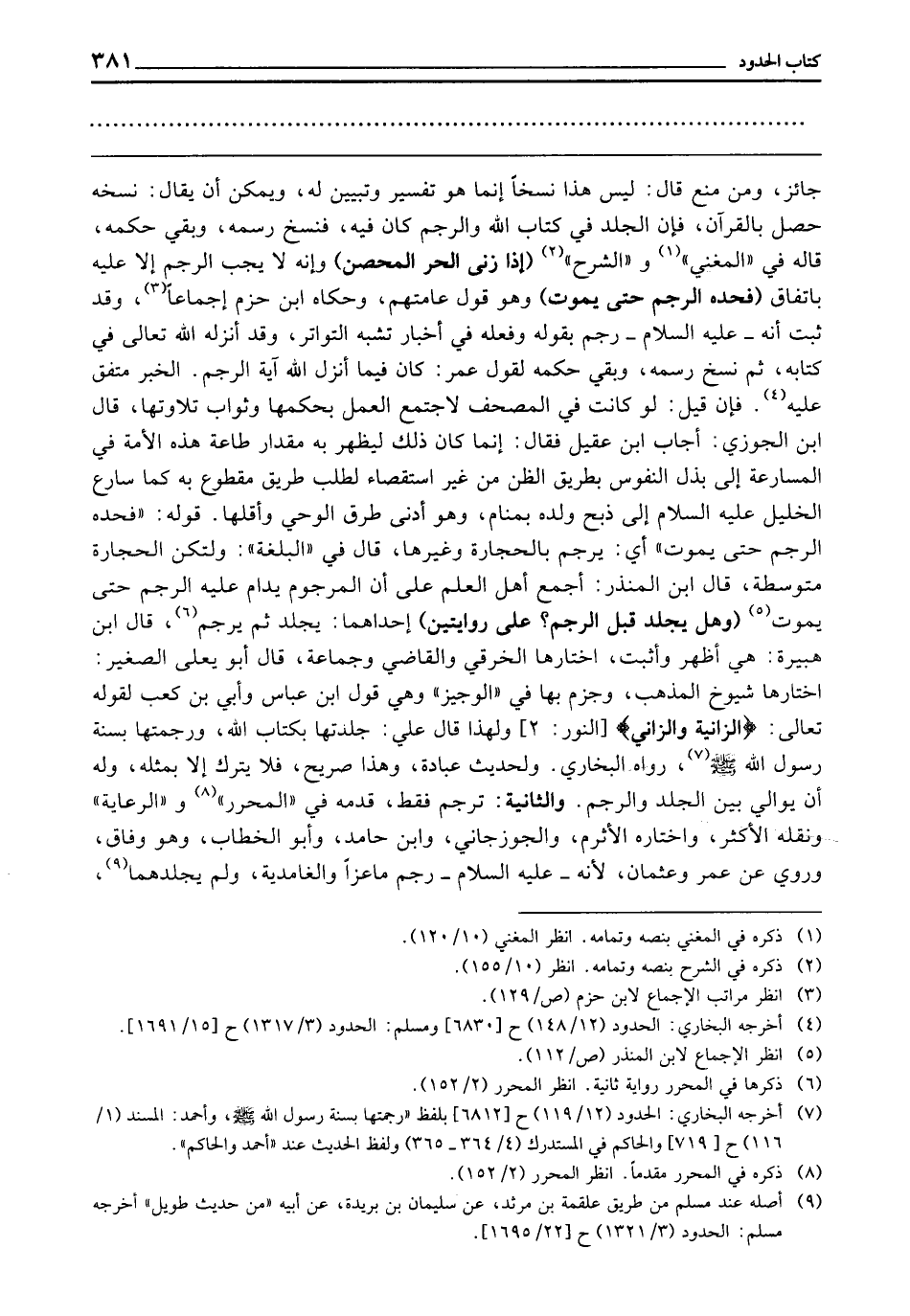 ـــــــــــــــــــــــــــــQجَائِزٌ، وَمَنْ مَنَعَ قَالَ: لَيْسَ هَذَا نَسْخًا، إِنَّمَا هُوَ تَفْسِيرٌ وَتَبْيِينٌ لَهُ، وَيُمْكِنُ أَنْ يُقَالَ: نَسْخُهُ حَصَلَ بِالْقُرْآنِ، فَإِنَّ الْجَلْدَ فِي كِتَابِ اللَّهِ، وَالرَّجْمَ كَانَ فِيهِ، فَنُسِخَ رَسْمُهُ وَبَقِيَ حُكْمُهُ، قَالَهُ فِي الْمُغْنِي وَالشَّرْحِ (إِذَا زَنَى الْحُرُّ الْمُحْصَنُ) وَإِنَّهُ لَا يَجِبُ الرَّجْمُ إِلَّا عَلَيْهِ بِاتِّفَاقٍ (فَحَدُّهُ الرَّجْمُ حَتَّى يَمُوتَ) وَهُوَ قَوْلُ عَامَّتِهِمْ، وَحَكَاهُ ابْنُ حَزْمٍ إِجْمَاعًا، وَقَدْ ثَبَتَ أَنَّهُ - عَلَيْهِ السَّلَامُ - رَجَمَ بِقَوْلِهِ وَفِعْلِهِ فِي أَخْبَارٍ تُشْبِهُ التَّوَاتُرَ، وَقَدْ أَنْزَلَهُ اللَّهُ تَعَالَى فِي كِتَابِهِ ثُمَّ نُسِخَ رَسْمُهُ وَبَقِيَ حُكْمُهُ، لِقَوْلِ عُمَرَ: كَانَ فِيمَا أَنْزَلَ اللَّهُ آيَةُ الرَّجْمِ. الْخَبَرُ مُتَّفَقٌ عَلَيْهِ. فَإِنْ قِيلَ: لَوْ كَانَتْ فِي الْمُصْحَفِ لَاجْتَمَعَ الْعَمَلُ بِحُكْمِهَا وَثَوَابِ تِلَاوَتِهَا، قَالَ ابْنُ الْجَوْزِيِّ: أَجَابَ ابْنُ عَقِيلٍ، فَقَالَ: إِنَّمَا كَانَ ذَلِكَ لِيَظْهَرَ بِهِ مِقْدَارُ طَاعَةِ هَذِهِ الْأُمَّةِ فِي الْمُسَارَعَةِ إِلَى بَذْلِ النُّفُوسِ بِطَرِيقِ الظَّنِّ مِنْ غَيْرِ اسْتِقْصَاءٍ لِطَلَبِ طَرِيقٍ مَقْطُوعٍ بِهِ، كَمَا سَارَعَ الْخَلِيلُ - عَلَيْهِ السَّلَامُ - إِلَى ذَبْحِ وَلَدِهِ بِمَنَامٍ، وَهُوَ أَدْنَى طُرُقِ الْوَحْيِ وَأَقَلُّهَا. قَوْلُهُ: " فَحَدُّهُ الرَّجْمُ حَتَّى يَمُوتَ " أَيْ: يُرْجَمُ بِالْحِجَارَةِ وَغَيْرِهَا، قَالَ فِي الْبُلْغَةِ: وَلْتَكُنِ الْحِجَارَةُ مُتَوَسِّطَةً، قَالَ ابْنُ الْمُنْذِرِ: أَجْمَعَ أَهْلُ الْعِلْمِ عَلَى أَنَّ الْمَرْجُومَ يُدَامُ عَلَيْهِ الرَّجْمُ حَتَّى يَمُوتَ (وَهَلْ يُجْلَدُ قَبْلَ الرَّجْمِ؟ عَلَى رِوَايَتَيْنِ) .