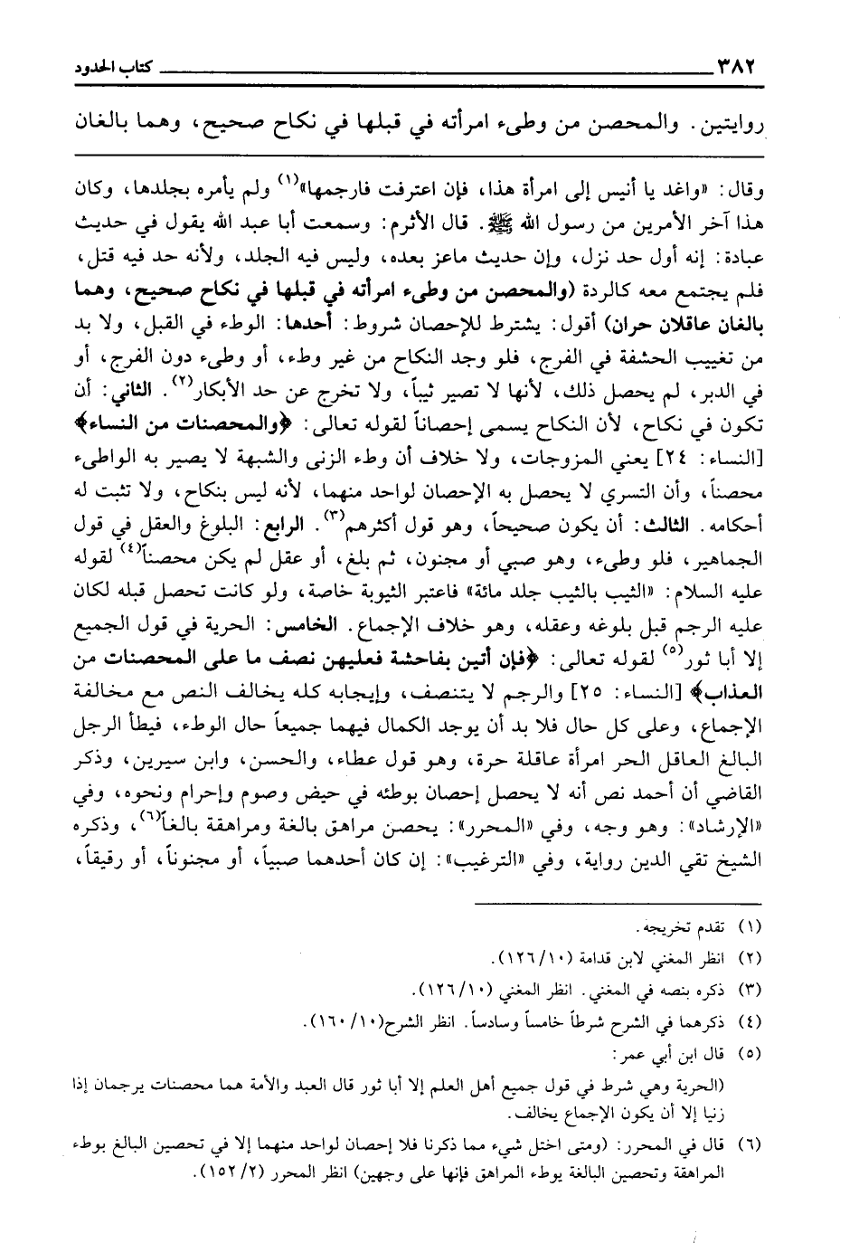 ـــــــــــــــــــــــــــــQوَقَالَ: «وَاغْدُ يَا أُنَيْسُ إِلَى امْرَأَةِ هَذَا، فَإِنِ اعْتَرَفَتْ فَارْجُمْهَا» وَلَمْ يَأْمُرْهُ بِجَلْدِهَا، وَكَانَ هَذَا آخِرَ الْأَمْرَيْنِ مِنْ رَسُولِ اللَّهِ - صَلَّى اللَّهُ عَلَيْهِ وَسَلَّمَ -، قَالَ الْأَثْرَمُ: وَسَمِعْتُ أَبَا عَبْدِ اللَّهِ، يَقُولُ فِي حَدِيثِ عُبَادَةَ: إِنَّهُ أَوَّلُ حَدٍّ نَزَلَ، وَإِنَّ حَدِيثَ مَاعِزٍ بَعْدَهُ، وَلَيْسَ فِيهِ الْجَلْدُ، وَلِأَنَّهُ حَدٌّ فِيهِ قَتْلٌ فَلَمْ يَجْتَمِعْ مَعَهُ كَالرِّدَّةِ (وَالْمُحْصَنُ مَنْ وَطِئَ امْرَأَتَهُ فِي قُبُلِهَا فِي نِكَاحٍ صَحِيحٍ، وَهُمَا بَالِغَانِ عَاقِلَانِ حُرَّانِ) أَقُولُ: يُشْتَرَطُ لِلْإِحْصَانِ شُرُوطٌ.