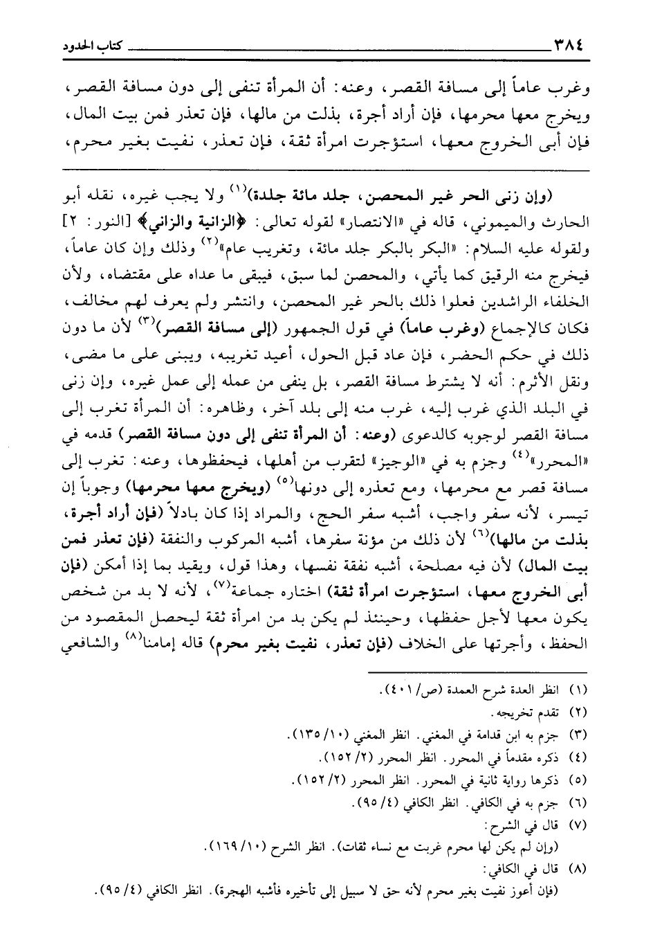 (وَإِنْ زَنَى الْحُرُّ غَيْرُ الْمُحْصَنِ جُلِدَ مِائَةَ جَلْدَةٍ) وَلَا يَجِبُ غَيْرُهُ، نَقَلَهُ أَبُو الْحَارِثِ وَالْمَيْمُونِيُّ، قَالَهُ فِي الِانْتِصَارِ، لِقَوْلِهِ تَعَالَى: {الزَّانِيَةُ وَالزَّانِي} [النور: 2] الْآيَةَ وَلِقَوْلِهِ - عَلَيْهِ السَّلَامُ -: «الْبِكْرُ بِالْبِكْرِ جَلْدُ مِائَةٍ وَتَغْرِيبُ عَامٍ» وَذَلِكَ وَإِنْ كَانَ عَامًّا فَيَخْرُجُ مِنْهُ الرَّقِيقُ كَمَا يَأْتِي، وَالْمُحْصَنُ لِمَا سَبَقَ، فَيَبْقَى مَا عَدَاهُ عَلَى مُقْتَضَاهُ، وَلِأَنَّ الْخُلَفَاءَ الرَّاشِدِينَ فَعَلُوا ذَلِكَ بِالْحُرِّ غَيْرِ الْمُحْصَنِ، وَانْتَشَرَ وَلَمْ يُعْرَفْ لَهُمْ مُخَالِفٌ، فَكَانَ كَالْإِجْمَاعِ (وَغُرِّبَ عَامًا) فِي قَوْلِ الْجُمْهُورِ (إِلَى مَسَافَةِ الْقَصْرِ) لِأَنَّ مَا دُونَ ذَلِكَ فِي حُكْمِ الْحَضَرِ، فَإِنْ عَادَ قَبْلَ الْحَوْلِ، أُعِيدَ تَغْرِيبُهُ، وَيُبْنَى عَلَى مَا مَضَى، وَنَقَلَ الْأَثْرَمُ: أَنَّهُ لَا يُشْتَرَطُ مَسَافَةُ الْقَصْرِ، بَلْ يُنْفَى مِنْ عَمَلِهِ إِلَى عَمَلِ غَيْرِهِ، وَإِنْ زَنَى فِي الْبَلَدِ الَّذِي غُرِّبَ إِلَيْهِ غُرِّبَ مِنْهُ إِلَى بَلَدٍ آخَرَ، وَظَاهِرُهُ: أَنَّ الْمَرْأَةَ تُغَرَّبُ إِلَى مَسَافَةِ الْقَصْرِ، لِوُجُوبِهِ كَالدَّعْوَى (وَعَنْهُ: أَنَّ الْمَرْأَةَ تُنْفَى إِلَى دُونِ مَسَافَةِ الْقَصْرِ) قَدَّمَهُ فِي الْمُحَرَّرِ، وَجَزَمَ بِهِ فِي الْوَجِيزِ، لِتَقْرُبَ مِنْ أَهْلِهَا فَيَحْفَظُوهَا، وَعَنْهُ: تُغَرَّبُ إِلَى مَسَافَةِ قَصْرٍ مَعَ مَحْرَمِهَا، وَمَعَ تَعَذُّرِهِ إِلَى دُونِهَا (وَيَخْرُجُ مَعَهَا مَحْرَمُهَا) وُجُوبًا إِنْ تَيَسَّرَ، لِأَنَّهُ سَفَرٌ وَاجِبٌ، أَشْبَهَ سَفَرَ الْحَجِّ، وَالْمُرَادُ إِذَا كَانَ بَاذِلًا (فَإِنْ أَرَادَ أُجْرَةً بُذِلَتْ مِنْ مَالِهَا) لِأَنَّ ذَلِكَ مِنْ مَئُونَةِ سِفْرِهَا، أَشْبَهَ الْمَرْكُوبَ وَالنَّفَقَةَ (فَإِنْ تَعَذَّرَ فَمِنْ بَيْتِ الْمالِ) لِأَنَّ فِيهِ مَصْلَحَةً، أَشْبَهَ نَفَقَةَ نَفْسِهَا، وَهَذَا قَوْلٌ، وَيُقَيَّدُ بِمَا إِذَا أَمْكَنَ (فَإِنْ أَبَى الْخُرُوجَ مَعَهَا اسْتُؤْجِرَتِ امْرَأَةٌ ثِقَةٌ) اخْتَارَهُ جَمَاعَةٌ، لِأَنَّهُ لَا بُدَّ مِنْ شَخْصٍ يَكُونُ مَعَهَا لِأَجْلِ حِفْظِهَا، وَحِينَئِذٍ لَمْ يَكُنْ بُدٌّ مِنِ امْرَأَةٍ ثِقَةٍ لِيَحْصُلَ الْمَقْصُودُ مِنَ الْحِفْظِ، وَأُجْرَتُهَا عَلَى الْخِلَافِ (فَإِنْ تَعَذَّرَ نُفِيَتْ بِغَيْرِ مَحْرَمٍ) قَالَهُ إِمَامُنَا وَالشَّافِعِيُّ،