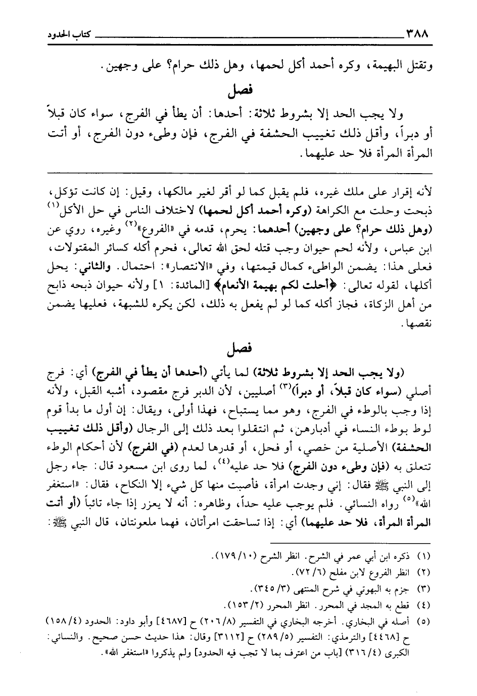 فَصْلٌ (وَلَا يَجِبُ الْحَدُّ إِلَّا بِشُرُوطٍ ثَلَاثَةٍ) لِمَا يَأْتِي (أَحَدُهَا: أَنْ يَطَأَ فِي الْفَرْجِ) أَيْ: فَرْجٍ أَصْلِيٍّ (سَوَاءٌ كَانَ قُبُلًا أَوْ دُبُرًا) أَصْلِيَّيْنِ، لِأَنَّ الدُّبُرَ فَرْجٌ مَقْصُودٌ أَشْبَهَ الْقُبُلَ، وَلِأَنَّهُ إِذَا وَجَبَ بِالْوَطْءِ فِي الْفَرْجِ، وَهُوَ مِمَّا يُسْتَبَاحُ، فَهَذَا أَوْلَى، وَيُقَالُ: إِنَّ أَوَّلَ مَا بَدَأَ قَوْمُ لُوطٍ بِوَطْءِ النِّسَاءِ فِي أَدْبَارِهِنَّ، ثُمَّ انْتَقَلُوا بَعْدَ ذَلِكَ إِلَى الرِّجَالِ (وَأَقَلُّ ذَلِكَ تَغْيِيبُ الْحَشَفَةِ) الْأَصْلِيَّةِ مِنْ خَصِيٍّ أَوْ فَحْلٍ، أَوْ قَدْرِهَا لِعَدِمٍ (فِي الْفَرْجِ) لِأَنَّ أَحْكَامَ الْوَطْءِ تَتَعَلَّقُ بِهِ (فَإِنْ وَطِئَ دُونَ الْفَرْجِ) فَلَا حَدَّ عَلَيْهِ، لِمَا رَوَى ابْنُ مَسْعُودٍ: قَالَ «جَاءَ رَجُلٌ إِلَى النَّبِيِّ - صَلَّى اللَّهُ عَلَيْهِ وَسَلَّمَ -، فَقَالَ: إِنِّي وَجَدْتُ امْرَأَةً فَأَصَبْتُ مِنْهَا كُلَّ شَيْءٍ إِلَّا النِّكَاحَ، فَقَالَ: اسْتَغْفِرِ اللَّهَ» . رَوَاهُ النَّسَائِيُّ. فَلَمْ يُوجِبْ عَلَيْهِ حَدًّا، وَظَاهِرُهُ أَنَّهُ لَا يُعَزَّرُ إِذَا جَاءَ تَائِبًا (أَوْ أَتَتِ الْمَرْأَةُ الْمَرْأَةَ فَلَا حَدَّ عَلَيْهِمَا) أَيْ: إِذَا تَسَاحَقَتِ امْرَأَتَانِ فَهُمَا مَلْعُونَتَانِ، قَالَ النَّبِيُّ - صَلَّى اللَّهُ عَلَيْهِ وَسَلَّمَ -: