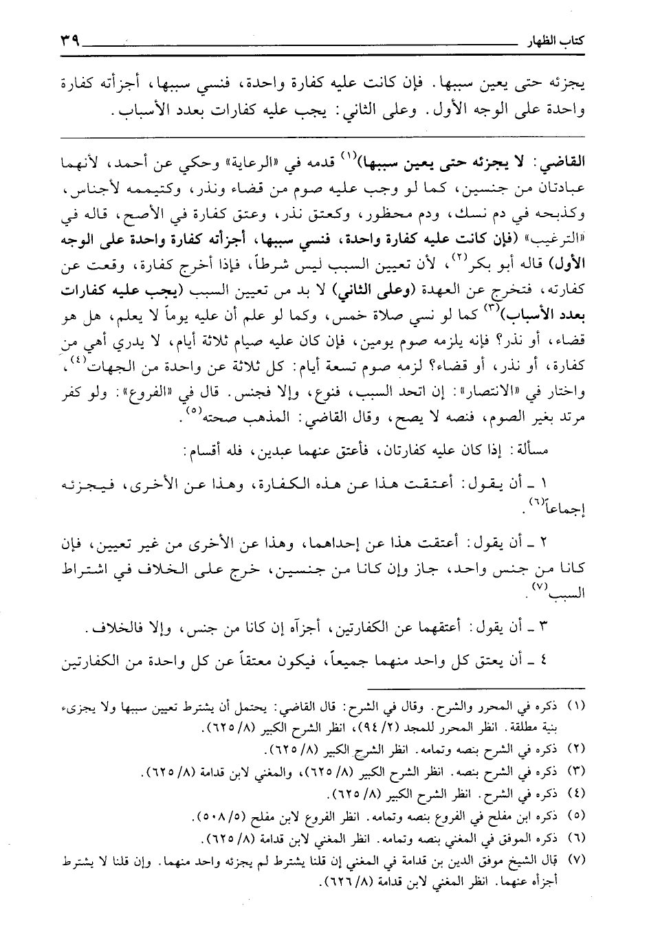 ـــــــــــــــــــــــــــــQالْقَاضِي لَا يُجْزِئُهُ حَتَّى يُعَيِّنَ سَبَبَهَا) . قَدَّمَهُ فِي " الرِّعَايَةِ " وَحَكَي عَنْ أَحْمَدَ ; لِأَنَّهُمَا عِبَادَتَانِ مِنْ جِنْسَيْنِ كَمَا لَوْ وَجَبَ عَلَيْهِ صَوْمٌ مِنْ قَضَاءٍ وَنَذْرٍ، وَكَتَيَمُّمِهِ لِأَجْنَاسٍ، وَكَذَبْحِهِ فِي دَمِ نُسُكٍ وَدَمٍ مَحْظُورٍ، وَكَعِتْقِ نَذْرٍ وَعِتْقِ كَفَّارَةٍ فِي الْأَصَحِّ، قَالَهُ فِي " التَّرْغِيبِ ". (فَإِنْ كَانَتْ عَلَيْهِ كَفَّارَةٌ وَاحِدَةٌ فَنَسِيَ سَبَبَهَا أَجْزَأَتْهُ كَفَّارَةٌ وَاحِدَةٌ عَلَى الْوَجْهِ الْأَوَّلِ) ، قَالَهُ أَبُو بَكْرٍ ; لِأَنَّ تَعْيِينَ السَّبَبِ لَيْسَ شَرْطًا، فَإِذَا أَخْرَجَ كَفَّارَةً وَقَعَتْ عَنْ كَفَّارَتِهِ، فَتَخْرُجُ عَنِ الْعُهْدَةِ. (وَعَلَى الثَّانِي) لَا بُدَّ مِنْ تَعْيِينِ السَّبَبِ (يَجِبُ عَلَيْهِ كَفَّارَاتٌ بِعَدَدِ الْأَسْبَابِ) كَمَا لَوْ نَسِيَ صَلَاةَ خَمْسٍ، وَكَمَا لَوْ عَلِمَ أَنَّ عَلَيْهِ يَوْمًا لَا يَعْلَمُ هَلْ هُوَ قَضَاءٌ، أَوْ نَذْرٌ؛ فَإِنَّهُ يَلْزَمُهُ صَوْمُ يَوْمَيْنِ، فَإِنْ كَانَ عَلَيْهِ صِيَامُ ثَلَاثَةِ أَيَّامٍ لَا يَدْرِي أَهِيَ مِنْ كَفَّارَةٍ، أَوْ نَذْرٍ، أَوْ قَضَاءٍ؛ لَزِمَهُ صَوْمُ تِسْعَةِ أَيَّامٍ، كُلُّ ثَلَاثَةٍ عَنْ وَاحِدَةٍ مِنَ الْجِهَاتِ. وَاخْتَارَ فِي " الِانْتِصَارِ " إِنِ اتَّحَدَ السَّبَبُ فَنَوْعٌ، وَإِلَّا فَجِنْسٌ. قَالَ فِي " الْفُرُوعِ ": وَلَوْ كَفَرَ مُرْتَدٌّ بِغَيْرِ الصَّوْمِ فَنَصُّهُ لَا يَصِحُّ، وَقَالَ الْقَاضِي: الْمَذْهَبُ صِحَّتُهُ.