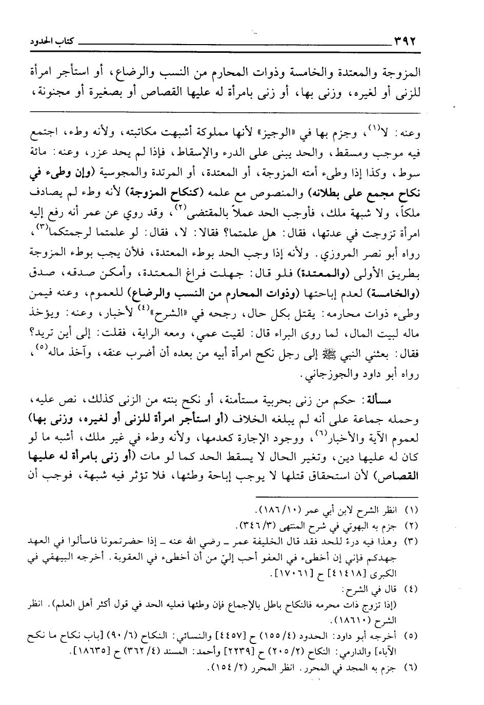 ـــــــــــــــــــــــــــــQوَعَنْهُ: لَا، وَجَزَمَ بِهَا فِي الْوَجِيزِ، لِأَنَّهَا مَمْلُوكَةٌ أَشْبَهَتْ مُكَاتَبَتَهُ، وَلِأَنَّهُ وَطْءٌ اجْتَمَعَ فِيهِ مُوجِبٌ وَمُسْقِطٌ، وَالْحَدُّ يُبْنَى عَلَى الدَّرْءِ وَالْإِسْقَاطِ فَإِذَا لَمْ يُحَدَّ عُزِّرَ، وَعَنْهُ: مِائَةُ سَوْطٍ وَكَذَا إِذَا وَطِئَ أَمَتَهُ الْمُزَوَّجَةَ، أَوِ الْمُعْتَدَّةَ، أَوِ الْمُرْتَدَّةَ، أَوِ الْمَجُوسِيَّةَ (وَإِنْ وَطِئَ فِي نِكَاحٍ مُجْمَعٍ عَلَى بُطْلَانِهِ) وَالْمَنْصُوصُ مَعَ عِلْمِهِ (كَنِكَاحِ الْمُزَوَّجَةِ) لِأَنَّهُ وَطْءٌ لَمْ يُصَادِفْ مِلْكًا وَلَا شُبْهَةَ مِلْكٍ، فَأَوْجَبَ الْحَدَّ عَمَلًا بِالْمُقْتَضَى، وَقَدْ رُوِيَ عَنْ عُمَرَ أَنَّهُ رُفِعَ إِلَيْهِ امْرَأَةٌ تَزَوَّجَتْ فِي عِدَّتِهَا، فَقَالَ: هَلْ عَلِمْتُمَا؟ فَقَالَا: لَا، فَقَالَ: لَوْ عَلِمْتُمَا لَرَجَمْتُكُمَا. رَوَاهُ أَبُو نَصْرٍ الْمَرْوَزِيُّ. وَلِأَنَّهُ إِذَا وَجَبَ الْحَدُّ بِوَطْءِ الْمُعْتَدَّةِ، فَلَأَنْ يَجِبُ بِوَطْءِ الْمُزَوَّجَةِ بِطَرِيقِ الْأَوْلَى (وَالْمُعْتَدَّةِ) فَلَوْ قَالَ: جَهِلْتُ فَرَاغَ الْمُعْتَدَّةِ، وَأَمْكَنَ صِدْقُهُ، صُدِّقَ (وَالْخَامِسَةِ) لِعَدَمِ إِبَاحَتِهَا (وَذَوَاتِ الْمَحَارِمِ مِنَ النَّسَبِ وَالرِّضَاعِ) لِلْعُمُومِ، وَعَنْهُ فِيمَنْ وَطِئَ ذَوَاتَ مَحَارِمِهِ: يُقْتَلُ بِكُلِّ حَالٍ، رَجَّحَهُ فِي الشَّرْحِ لِأَخْبَارٍ، وَعَنْهُ: وَيُؤْخَذُ مَالُهُ لِبَيْتِ الْمَالِ، لِمَا «رَوَى الْبَرَاءُ، قَالَ: لَقِيتُ عَمِّي وَمَعَهُ الرَّايَةُ، فَقُلْتُ: إِلَى أَيْنَ تُرِيدُ؟ فَقَالَ: بَعَثَنِي النَّبِيُّ - صَلَّى اللَّهُ عَلَيْهِ وَسَلَّمَ - إِلَى رَجُلٍ نَكَحَ امْرَأَةَ أَبِيهِ مِنْ بَعْدِهِ، أَنْ أَضْرِبَ عُنُقَهُ، وَآخُذَ مَالَهُ» . رَوَاهُ أَبُو دَاوُدَ وَالْجَوْزَجَانِيُّ.