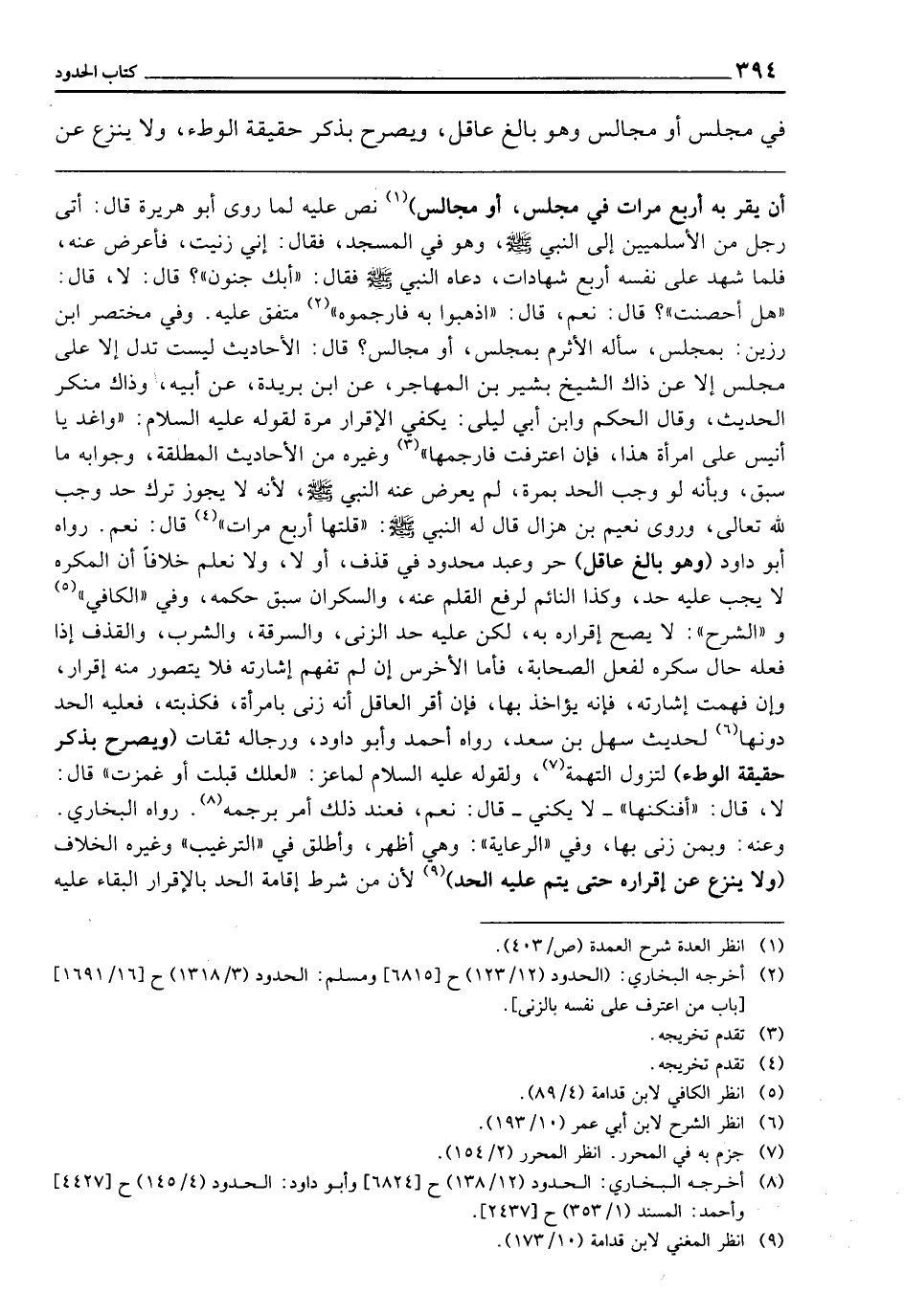 ـــــــــــــــــــــــــــــQأَنْ يُقِرَّ بِهِ أَرْبَعَ مَرَّاتٍ فِي مَجْلِسٍ أَوْ مَجَالِسَ) نَصَّ عَلَيْهِ، لِمَا رَوَى أَبُو هُرَيْرَةَ، قَالَ: «أَتَى رَجُلٌ مِنَ الْأَسْلَمِيَّيْنِ إِلَى النَّبِيِّ - صَلَّى اللَّهُ عَلَيْهِ وَسَلَّمَ - وَهُوَ فِي الْمَسْجِدِ، فَقَالَ: إِنِّي زَنَيْتُ، فَأَعْرَضَ عَنْهُ، فَلَمَّا شَهِدَ عَلَى نَفْسِهِ أَرْبَعَ شَهَادَاتٍ دَعَاهُ النَّبِيُّ - صَلَّى اللَّهُ عَلَيْهِ وَسَلَّمَ -، فَقَالَ: أَبِكَ جُنُونٌ؟ قَالَ: لَا، قَالَ: هَلْ أُحْصِنْتَ؟ قَالَ: نَعَمْ، قَالَ: اذْهَبُوا بِهِ فَارْجُمُوهُ» . مُتَّفَقٌ عَلَيْهِ. وَفِي مُخْتَصَرِ ابْنِ رَزِينٍ: بِمَجْلِسٍ، سَأَلَهُ الْأَثْرَمُ: بِمَجْلِسٍ أَوْ مَجَالِسَ؟ قَالَ: الْأَحَادِيثُ لَيْسَتْ تَدُلُّ إِلَّا عَلَى مَجْلِسٍ، إِلَّا عَنْ ذَاكَ الشَّيْخِ بَشِيرِ بْنِ الْمُهَاجِرِ، عَنِ ابْنِ بُرَيْدَةَ، عَنْ أَبِيهِ، وَذَاكَ مُنْكَرُ الْحَدِيثِ، وَقَالَ الْحَكَمُ وَابْنُ أَبِي لَيْلَى: يَكْفِي الْإِقْرَارُ مَرَّةً، لِقَوْلِهِ - عَلَيْهِ السَّلَامُ -: «وَاغْدُ يَا أُنَيْسُ عَلَى امْرَأَةِ هَذَا، فَإِنِ اعْتَرَفَتْ فَارْجُمْهَا» . وَغَيْرِهِ مِنَ الْأَحَادِيثِ الْمُطْلَقَةِ، وَجَوَابُهُ: مَا سَبَقَ، وَبِأَنَّهُ لَوْ وَجَبَ الْحَدُّ بِمَرَّةٍ لَمْ يُعْرِضْ عَنْهُ النَّبِيُّ - صَلَّى اللَّهُ عَلَيْهِ وَسَلَّمَ -، لِأَنَّهُ لَا يَجُوزُ تَرْكُ حَدٍّ وَجَبَ لِلَّهِ تَعَالَى، «وَرَوَى نُعَيْمُ بْنُ هُزَالٍ، قَالَ لَهُ النَّبِيُّ - صَلَّى اللَّهُ عَلَيْهِ وَسَلَّمَ -: قُلْتَهَا أَرْبَعَ مَرَّاتٍ قَالَ: نَعَمْ» . رَوَاهُ أَبُو دَاوُدَ (وَهُوَ بَالِغٌ عَاقِلٌ) حُرٌّ وَعَبْدٌ، مَحْدُودٌ فِي قَذْفٍ أَوْ لَا، وَلَا نَعْلَمُ خِلَافًا أَنَّ الْمُكْرَهَ لَا يَجِبُ عَلَيْهِ حَدٌّ، وَكَذَا النَّائِمُ لِرَفْعِ الْقَلَمِ عَنْهُ، وَالسَّكْرَانُ سَبَقَ حُكْمُهُ، وَفِي الْكَافِي وَالشَّرْحِ: لَا يَصِحُّ إِقْرَارُهُ بِهِ، لَكِنَّ عَلَيْهِ حَدَّ الزِّنَا وَالسَّرِقَةِ وَالشُّرْبِ وَالْقَذْفِ، إِذَا فَعَلَهُ حَالَ سُكْرِهِ، لِفِعْلِ الصَّحَابَةِ، فَأَمَّا الْأَخْرَسُ إِنْ لَمْ تُفْهَمْ إِشَارَتُهُ فَلَا يُتَصَوَّرُ مِنْهُ إِقْرَارٌ، وَإِنْ فُهِمَتْ إِشَارَتُهُ فَإِنَّهُ يُؤَاخَذُ بِهَا، فَإِنْ أَقَرَّ الْعَاقِلُ أَنَّهُ زَنَى بِامْرَأَةٍ فَكَذَّبَتْهُ، فَعَلَيْهِ الْحَدُّ دُونَهَا، لِحَدِيثِ سَهْلِ بْنِ سَعْدٍ، رَوَاهُ أَحْمَدُ وَأَبُو دَاوُدَ، وَرِجَالُهُ ثِقَاتٌ (وَيُصَرِّحُ بِذِكْرِ حَقِيقَةِ الْوَطْءِ) لِتَزُولَ التُّهْمَةُ، وَلِقَوْلِهِ - عَلَيْهِ السَّلَامُ - لِمَاعِزٍ: «لَعَلَّكَ قَبَّلْتَ، أَوْ غَمَزْتَ، قَالَ: لَا، قَالَ: أَفَنِكْتَهَا؟ لَا يُكَنِّي، قَالَ: نَعَمْ. فَعِنْدَ ذَلِكَ أَمَرَ بِرَجْمِهِ» . رَوَاهُ الْبُخَارِيُّ. وَعَنْهُ: وَبِمَنْ زَنَى بِهَا، وَفِي الرِّعَايَةِ: وَهِيَ أَظْهَرُ، وَأَطْلَقَ فِي التَّرْغِيبِ وَغَيْرِهِ الْخِلَافَ (وَلَا يَنْزِعُ عَنْ إِقْرَارِهِ حَتَّى يَتِمَّ عَلَيْهِ الْحَدُّ) لِأَنَّ مِنْ شَرْطِ إِقَامَةِ الْحَدِّ بِالْإِقْرَارِ الْبَقَاءُ عَلَيْهِ