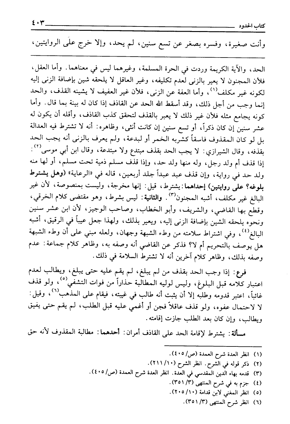 ـــــــــــــــــــــــــــــQالْحَدِّ، وَالْآيَةُ الْكَرِيمَةُ وَرَدَتْ فِي الْحُرَّةِ الْمُسْلِمَةِ، وَغَيْرُهُمَا لَيْسَ فِي مَعْنَاهُمَا، وَأَمَّا الْعَقْلُ، فَلِأَنَّ الْمَجْنُونَ لَا يُعَيَّرُ بِالزِّنَا، لِعَدَمِ تَكْلِيفِهِ، وَغَيْرُ الْعَاقِلِ لَا يَلْحَقُهُ شَيْنٌ بِإِضَافَةِ الزِّنَا إِلَيْهِ لِكَوْنِهِ غَيْرَ مُكَلَّفٍ، وَأَمَّا الْعِفَّةُ عَنِ الزِّنَا فَلِأَنَّ غَيْرَ الْعَفِيفِ لَا يَشِينُهُ الْقَذْفُ، وَالْحَدُّ إِنَّمَا وَجَبَ مِنْ أَجْلِ ذَلِكَ، وَقَدْ أَسْقَطَ اللَّهُ الْحَدَّ عَنِ الْقَاذِفِ إِذَا كَانَ لَهُ بَيِّنَةٌ بِمَا قَالَ، وَأَمَّا كَوْنُهُ يُجَامِعُ مِثْلُهُ فَلِأَنَّ غَيْرَ ذَلِكَ لَا يُعَيَّرُ بِالْقَذْفِ، لِتَحَقُّقِ كَذِبِ الْقَاذِفِ، وَأَقَلُّهُ أَنْ يَكُونَ لَهُ عَشْرُ سِنِينَ إِنْ كَانَ ذَكَرًا، أَوْ تِسْعُ سِنِينَ إِنْ كَانَتْ أُنْثَى، وَظَاهِرُهُ: أَنَّهُ لَا تُشْتَرَطُ فِيهِ الْعَدَالَةُ، بَلْ لَوْ كَانَ الْمَقْذُوفُ فَاسِقًا، كَشُرْبِهِ الْخَمْرَ أَوْ لِبِدْعَةٍ، وَلَمْ يُعْرَفْ بِالزِّنَا أَنَّهُ يَجِبُ الْحَدُّ بِقَذْفِهِ، وَقَالَ الشِّيرَازِيُّ: لَا يَجِبُ الْحَدُّ بِقَذْفِ مُبْتَدِعٍ وَلَا مُبْتَدِعَةٍ، وَقَالَ ابْنُ أَبِي مُوسَى: إِذَا قَذَفَ أُمَّ وَلَدٍ - رَجُلٌ، وَلَهُ مِنْهَا وَلَدٌ؟ حُدَّ، وَإِذَا قَذَفَ مُسْلِمٌ ذِمِّيَّةً تَحْتَ مُسْلِمٍ، أَوْ لَهَا مِنْهُ وَلَدٌ حُدَّ فِي رِوَايَةٍ، وَإِنْ قَذَفَ عَبْدٌ عَبْدًا جُلِدَ أَرْبَعِينَ، قَالَهُ فِي الرِّعَايَةِ (وَهَلْ يُشْتَرَطُ بُلُوغُهُ؟ عَلَى رِوَايَتَيْنِ) .