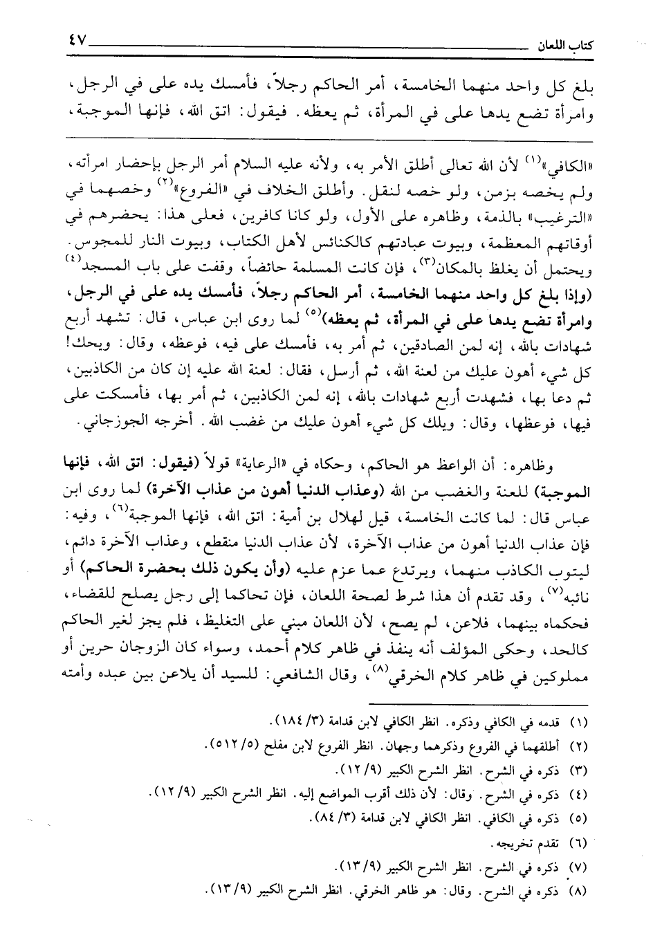 ـــــــــــــــــــــــــــــQ" الْكَافِي " ; لِأَنَّ اللَّهَ تَعَالَى أَطْلَقَ الْأَمْرَ بِهِ، وَلِأَنَّهُ - عَلَيْهِ السَّلَامُ - أَمَرَ الرَّجُلَ بِإِحْضَارِ امْرَأَتِهِ، وَلَمْ يَخُصَّهُ بِزَمَنٍ، وَلَوْ خَصَّهُ لَنُقِلَ. وَأَطْلَقَ الْخِلَافَ فِي " الْفُرُوعِ " وَخَصَّهُمَا فِي " التَّرْغِيبِ " بِالذِّمَّةِ. وَظَاهِرُهُ عَلَى الْأَوَّلِ، وَلَوْ كَانَا كَافِرَيْنِ، فَعَلَى هَذَا يَحْضُرُهُمْ فِي أَوْقَاتِهِمُ الْمُعَظَّمَةِ وَبُيُوتِ عِبَادَتِهِمْ كَالْكَنَائِسِ لِأَهْلِ الْكِتَابِ، وَبُيُوتِ النَّارِ لِلْمَجُوسِ. وَيُحْتَمَلُ أَنْ يُغْلِظَ بِالْمَكَانِ، فَإِنْ كَانَتِ الْمُسْلِمَةُ حَائِضًا، وَقَفَتْ عَلَى بَابِ الْمَسْجِدِ. (وَإِذَا بَلَغَ كُلُّ وَاحِدٍ مِنْهُمَا الْخَامِسَةَ أَمَرَ الْحَاكِمُ رَجُلًا فَأَمْسَكَ يَدَهُ عَلَى فِي الرَّجُلِ وَامْرَأَةً تَضَعُ يَدَهَا عَلَى فِي الْمَرْأَةِ، ثُمَّ يَعِظُهُ) ، لِمَا رَوَى ابْنُ عَبَّاسٍ قَالَ: «تَشْهَدُ أَرْبَعَ شَهَادَاتٍ بِاللَّهِ إِنَّهُ لِمَنِ الصَّادِقِينَ، ثُمَّ أَمَرَ بِهِ فَأَمْسَكَ عَلَى فِيهِ، فَوَعَظَهُ، وَقَالَ: وَيْحَكَ كُلُّ شَيْءٍ أَهْوَنُ عَلَيْكَ مِنْ لَعْنَةِ اللَّهِ، ثُمَّ أَرْسَلَ، فَقَالَ: لَعْنَةُ اللَّهِ عَلَيْهِ إِنْ كَانَ مِنَ الْكَاذِبِينَ، ثُمَّ دَعَا بِهَا فَشَهِدَتْ أَرْبَعَ شَهَادَاتٍ بِاللَّهِ إِنَّهُ لِمَنِ الْكَاذِبِينَ، ثُمَّ أَمَرَ بِهَا فَأَمْسَكَتْ عَلَى فِيهَا فَوَعَظَهَا، وَقَالَ: وَيْلُكِ، كُلُّ شَيْءٍ أَهْوَنُ عَلَيْكِ مِنْ غَضَبِ اللَّهِ» . أَخْرَجَهُ الْجَوْزَجَانِيُّ.