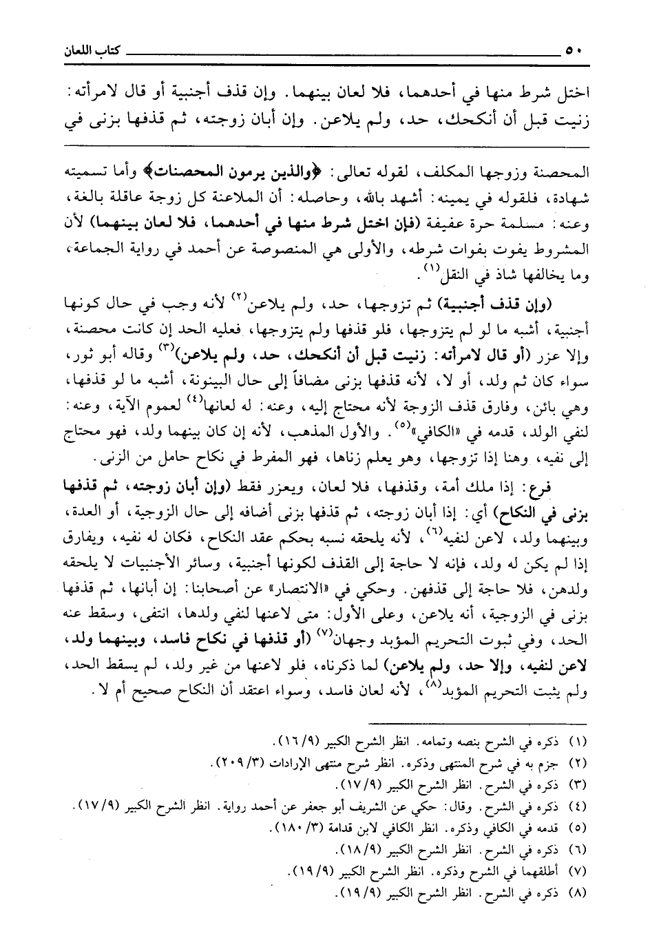 ـــــــــــــــــــــــــــــQالْمُحْصَنَةُ وَزَوْجُهَا الْمُكَلَّفُ لِقَوْلِهِ تَعَالَى: {وَالَّذِينَ يَرْمُونَ الْمُحْصَنَاتِ} [النور: 4] وَأَمَّا تَسْمِيَتُهُ شَهَادَةً فَلِقَوْلِهِ فِي يَمِينِهِ أَشْهَدُ بِاللَّهِ، وَحَاصِلُهُ أَنَّ الْمُلَاعَنَةَ كُلُّ زَوْجَةٍ عَاقِلَةٍ بَالِغَةٍ. وَعَنْهُ: مُسْلِمَةٌ حُرَّةٌ عَفِيفَةٌ. (فَإِنِ اخْتَلَّ شَرْطٌ مِنْهَا فِي أَحَدِهِمَا، فَلَا لِعَانَ بَيْنَهُمَا) لِأَنَّ الْمَشْرُوطَ يَفُوتُ بِفَوَاتِ شَرْطِهِ، وَالْأَوْلَى هِيَ الْمَنْصُوصَةُ عَنْ أَحْمَدَ فِي رِوَايَةِ الْجَمَاعَةِ وَمَا يُخَالِفُهَا شَاذٌّ فِي النَّقْلِ.