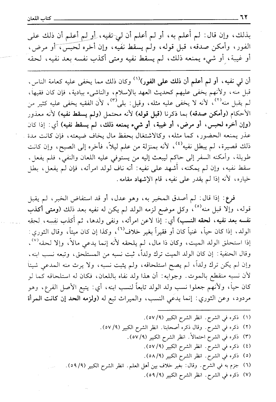 بِذَلِكَ، وَإِنْ قَالَ: لَمْ أَعْلَمْ بِهِ، أَوْ لَمْ أَعْلَمْ أَنَّ لِي نَفْيَهُ، أَوْ لَمْ أَعْلَمْ أَنَّ ذَلِكَ عَلَى الْفَوْرِ وَأَمْكَنَ صِدْقُهُ قَبْلَ قَوْلِهِ وَلَمْ يَسْقُطْ نَفْيُهُ. وَإِنْ أَخَّرَهُ لِحَبْسٍ، أَوْ مَرَضٍ، أَوْ غَيْبَةٍ، أَوْ شَيْءٍ يَمْنَعُهُ ذَلِكَ لَمْ يَسْقُطْ نَفْيُهُ، وَمَتَى أَكْذَبَ نَفْسَهُ بَعْدَ نَفْيِهِ لَحِقَهُ