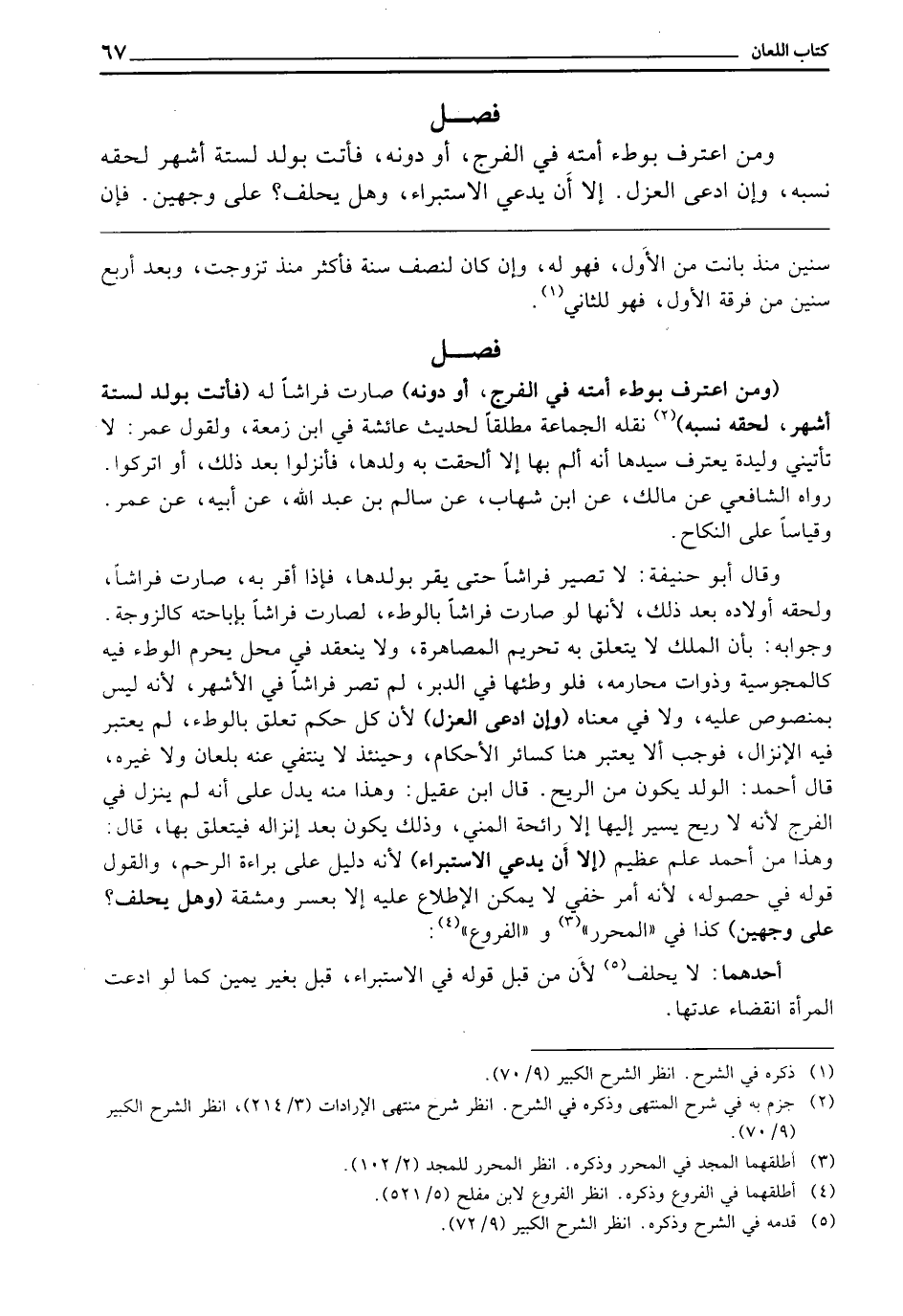 وَقَالَ أَبُو حَنِيفَةَ: لَا تَصِيرُ فِرَاشًا حَتَّى يُقِرَّ بِوَلَدِهَا، فَإِذَا أَقَرَّ بِهِ صَارَتْ فِرَاشًا وَلَحِقَهُ أَوْلَادُهُ بَعْدَ ذَلِكَ ; لِأَنَّهَا لَوْ صَارَتْ فِرَاشًا بِالْوَطْءِ لَصَارَتْ فِرَاشًا بِإِبَاحَتِهِ كَالزَّوْجَةِ. وَجَوَابُهُ: بِأَنَّ الْمِلْكَ لَا يَتَعَلَّقُ بِهِ تَحْرِيمُ الْمُصَاهَرَةِ، وَلَا يَنْعَقِدُ فِي مَحَلٍّ يَحْرُمُ الْوَطْءُ فِيهِ كَالْمَجُوسِيَّةِ وَذَوَاتِ مَحَارِمِهِ، فَلَوْ وَطِئَهَا فِي الدُّبُرِ لَمْ تَصِرْ فِرَاشًا فِي الْأَشْهَرِ ; لِأَنَّهُ لَيْسَ بِمَنْصُوصٍ عَلَيْهِ، وَلَا فِي مَعْنَاهُ، (وَإِنِ ادَّعَى الْعَزْلَ) ، لِأَنَّ كُلَّ حُكْمٍ تَعَلَّقَ بِالْوَطْءِ لَمْ يُعْتَبَرْ فِيهِ الْإِنْزَالُ فَوَجَبَ أَلَّا يُعْتَبَرَ هُنَا كَسَائِرِ الْأَحْكَامِ، وَحِينَئِذٍ لَا يَنْتَفِي عَنْهُ بِلِعَانٍ، وَلَا غَيْرِهِ. قَالَ أَحْمَدُ: الْوَلَدُ يَكُونُ مِنَ الرِّيحِ، قَالَ ابْنُ عَقِيلٍ: وَهَذَا مِنْهُ يَدُلُّ عَلَى أَنَّهُ لَمْ يُنْزِلْ فِي الْفَرْجِ ; لِأَنَّهُ لَا رِيحٌ يَسِيرُ إِلَيْهَا إِلَّا رَائِحَةُ الْمَنِيِّ، وَذَلِكَ يَكُونُ بَعْدَ إِنْزَالِهِ فَيَتَعَلَّقُ بِهَا. قَالَ: وَهَذَا مِنْ أَحْمَدَ عِلْمٌ عَظِيمٌ، (إِلَّا أَنْ يَدَّعِيَ الِاسْتِبْرَاءَ) لِأَنَّهُ دَلِيلٌ عَلَى بَرَاءَةِ الرَّحِمِ. وَالْقَوْلُ قَوْلُهُ فِي حُصُولِهِ ; لِأَنَّهُ أَمْرٌ خَفِيٌّ، لَا يُمْكِنُ الِاطِّلَاعُ عَلَيْهِ إِلَّا بِعُسْرٍ وَمَشَقَّةٍ. (وَهَلْ يَحْلِفُ؛ عَلَى وَجْهَيْنِ) . كَذَا فِي " الْمُحَرَّرِ " وَ " الْفُرُوعِ ".