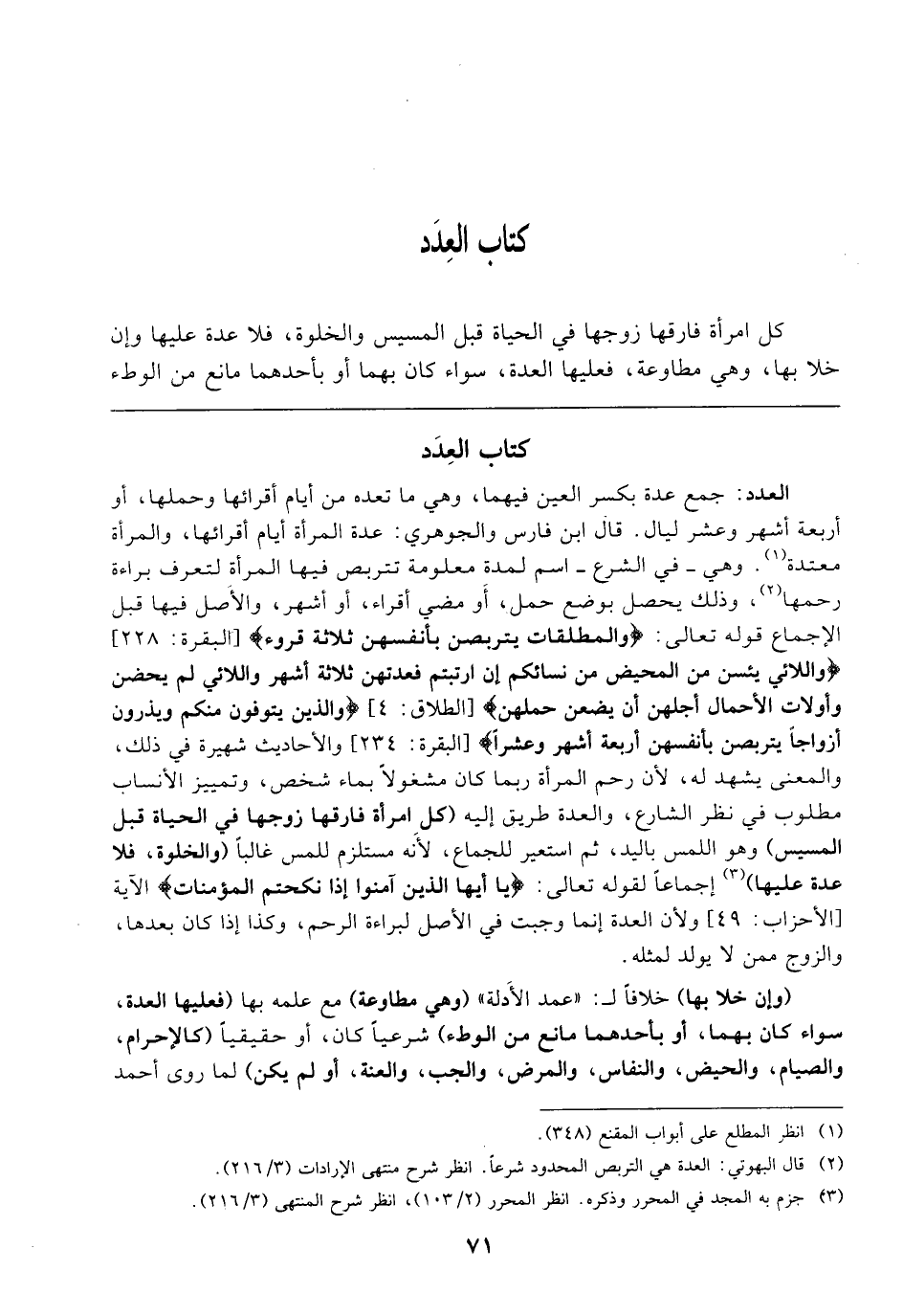 ِ الْعِدَدُ جَمْعُ عِدَّةٍ بِكَسْرِ الْعَيْنِ فِيهِمَا، وَهِيَ مَا تَعُدُّهُ مِنْ أَيَّامِ أَقْرَائِهَا وَحَمْلِهَا، أَوْ أَرْبَعَةِ أَشْهُرٍ وَعَشْرِ لَيَالٍ. قَالَ ابْنُ فَارِسٍ، وَالْجَوْهَرِيُّ: عِدَّةُ الْمَرْأَةِ أَيَّامُ أَقْرَائِهَا. وَالْمَرْأَةُ مُعْتَدَّةٌ، وَهِيَ فِي الشَّرْعِ: اسْمٌ لِمُدَّةٍ مَعْلُومَةٍ تَتَرَبَّصُ فِيهَا الْمَرْأَةُ لِتَعْرِفَ بَرَاءَةَ رَحِمِهَا، وَذَلِكَ يَحْصُلُ بِوَضْعِ حَمْلٍ، أَوْ مُضِيِّ أَقْرَاءٍ، أَوْ أَشْهُرٍ. وَالْأَصْلُ فِيهَا قَبْلَ الْإِجْمَاعِ قَوْله تَعَالَى: {وَالْمُطَلَّقَاتُ يَتَرَبَّصْنَ بِأَنْفُسِهِنَّ ثَلاثَةَ قُرُوءٍ} [البقرة: 228] {وَاللائِي يَئِسْنَ مِنَ الْمَحِيضِ مِنْ نِسَائِكُمْ إِنِ ارْتَبْتُمْ فَعِدَّتُهُنَّ ثَلاثَةُ أَشْهُرٍ وَاللائِي لَمْ يَحِضْنَ وَأُولاتُ الأَحْمَالِ أَجَلُهُنَّ أَنْ يَضَعْنَ حَمْلَهُنَّ} [الطلاق: 4] {وَالَّذِينَ يُتَوَفَّوْنَ مِنْكُمْ وَيَذَرُونَ أَزْوَاجًا يَتَرَبَّصْنَ بِأَنْفُسِهِنَّ أَرْبَعَةَ أَشْهُرٍ وَعَشْرًا} [البقرة: 234] . وَالْأَحَادِيثُ شَهِيرَةٌ فِي ذَلِكَ، وَالْمَعْنَى يَشْهَدُ لَهُ ; لِأَنَّ رَحِمَ الْمَرْأَةِ رُبَّمَا كَانَ مَشْغُولًا بِمَاءِ شَخْصٍ. وَتَمْيِيزُ الْأَنْسَابِ مَطْلُوبٌ فِي نَظَرِ الشَّارِعِ، وَالْعِدَّةُ طَرِيقٌ إِلَيْهِ. (كُلُّ امْرَأَةٍ فَارَقَهَا زَوْجُهَا فِي الْحَيَاةِ قَبْلَ الْمَسِيسِ) وَهُوَ اللَّمْسُ بِالْيَدِ، ثُمَّ اسْتُعِيرَ لِلْجِمَاعِ ; لِأَنَّهُ مُسْتَلْزِمٌ لِلْمَسِّ غَالِبًا. (وَالْخَلْوَةُ، فَلَا عِدَّةَ عَلَيْهَا) ، إِجْمَاعًا لِقَوْلِهِ تَعَالَى: {يَا أَيُّهَا الَّذِينَ آمَنُوا إِذَا نَكَحْتُمُ الْمُؤْمِنَاتِ} [الأحزاب: 49] الْآيَةَ، وَلِأَنَّ الْعِدَّةَ إِنَّمَا وَجَبَتْ فِي الْأَصْلِ لِبَرَاءَةِ الرَّحِمِ، وَكَذَا إِذَا كَانَ بَعْدَهَا، وَالزَّوْجُ مِمَّنْ لَا يُولَدُ لِمِثْلِهِ.