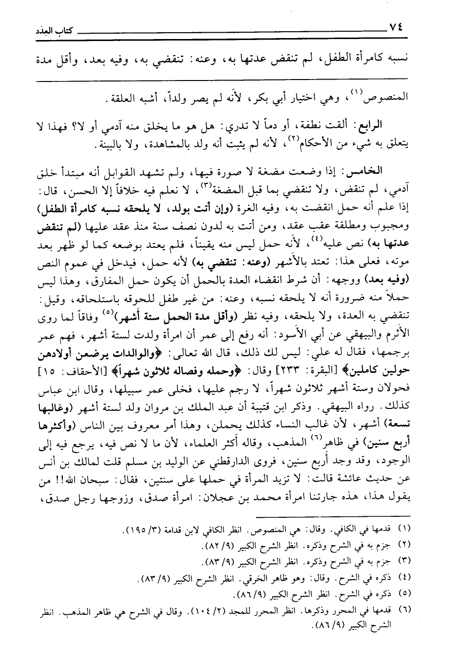الْخَامِسُ: إِذَا وُضِعَتْ مُضْغَةٌ، لَا صُورَةَ فِيهَا، وَلَمْ تَشْهَدِ الْقَوَابِلُ أَنَّهُ مُبْتَدَأُ خَلْقِ آدَمِيٍّ لَمْ تَنْقَضِ، وَلَا تَنْقَضِي بِمَا قَبْلَ الْمُضْغَةِ، لَا نَعْلَمُ فِيهِ خِلَافًا إِلَّا الْحَسَنَ، قَالَ: إِذَا عَلِمَ أَنَّهُ حَمْلٌ انْقَضَتْ بِهِ، وَفِيهِ الْغِرَّةُ. (وَإِنْ أَتَتْ بِوَلَدٍ، لَا يَلْحَقُهُ نَسَبُهُ كَامْرَأَةِ الطِّفْلِ) وَمَجْبُوبٍ وَمُطَلَّقَةٍ عَقِبَ عَقْدٍ، وَمَنْ أَتَتْ بِهِ لِدُونِ نِصْفِ سَنَةٍ مُنْذُ عَقَدَ عَلَيْهَا. (لَمْ تَنْقَضِ عِدَّتُهَا بِهِ) نَصَّ عَلَيْهِ ; لِأَنَّهُ حَمْلٌ لَيْسَ مِنْهُ يَقِينًا، فَلَمْ يَعْتَدَّ بِوَضْعِهِ كَمَا لَوْ ظَهَرَ بَعْدَ مَوْتِهِ، فَعَلَى هَذَا تَعْتَدُّ بِالْأَشْهُرِ. (وَعَنْهُ: تَنْقَضِي بِهِ) لِأَنَّهُ حَمْلٌ فَيَدْخُلُ فِي عُمُومِ النَّصِّ (وَفِيهِ بُعْدٌ) . وَوَجْهُهُ أَنَّ شَرْطَ انْقِضَاءِ الْعِدَّةِ بِالْحَمْلِ أَنْ يَكُونَ حَمْلَ الْمُفَارِقِ، وَهَذَا لَيْسَ حَمْلًا مِنْهُ ضَرُورَةُ أَنَّهُ لَا يَلْحَقُهُ نَسَبُهُ. وَعَنْهُ: مِنْ غَيْرِ طِفْلٍ لِلُحُوقِهِ بِاسْتِلْحَاقِهِ، وَقِيلَ: تَنْقَضِي بِهِ الْعِدَّةُ، وَلَا يَلْحَقُهُ. وَفِيهِ نَظَرٌ (وَأَقَلُّ مُدَّةِ الْحَمْلِ سِتَّةُ أَشْهُرٍ) . وِفَاقًا لِمَا رَوَى الْأَثْرَمُ، وَالْبَيْهَقِيُّ، عَنْ أَبِي الْأَسْوَدِ، أَنَّهُ رَفَعَ إِلَى عُمَرَ أَنَّ امْرَأَةً وَلَدَتْ لِسِتَّةِ أَشْهُرٍ، فَهَمَّ عُمَرُ بِرَجْمِهَا، فَقَالَ لَهُ عَلِيٌّ: لَيْسَ لَكَ ذَلِكَ، قَالَ اللَّهُ تَعَالَى {وَالْوَالِدَاتُ يُرْضِعْنَ أَوْلادَهُنَّ حَوْلَيْنِ كَامِلَيْنِ} [البقرة: 233] . وَقَالَ {وَحَمْلُهُ وَفِصَالُهُ ثَلاثُونَ شَهْرًا} [الأحقاف: 15] فَحَوْلَانِ وَسِتَّةُ أَشْهُرٍ ثَلَاثُونَ شَهْرًا، لَا رَجْمَ عَلَيْهَا. فَخَلَّى عُمَرُ سَبِيلَهَا، وَقَالَ ابْنُ عَبَّاسٍ كَذَلِكَ. رَوَاهُ الْبَيْهَقِيُّ، وَذَكَرَ ابْنُ قُتَيْبَةَ أَنَّ عَبْدَ الْمَلِكِ بْنَ مَرْوَانَ وُلِدَ لِسِتَّةِ أَشْهُرٍ (وَغَالِبُهَا تِسْعَةُ) أَشْهُرٍ ; لِأَنَّ غَالِبَ النِّسَاءِ كَذَلِكَ يَحْمِلْنَ، وَهَذَا أَمْرٌ مَعْرُوفٌ بَيْنَ النَّاسِ، (وَأَكْثَرُهَا أَرْبَعُ سِنِينَ) فِي ظَاهِرِ الْمَذْهَبِ، وَقَالَهُ أَكْثَرُ الْعُلَمَاءِ ; لِأَنَّ مَا لَا نَصَّ فِيهِ يَرْجِعُ فِيهِ إِلَى الْوُجُودِ، وَقَدْ وُجِدَ أَرْبَعُ سِنِينَ، فَرَوَى الدَّارَقُطْنِيُّ عَنِ الْوَلِيدِ بْنِ مُسْلِمٍ، قُلْتُ لِمَالِكِ بْنِ أَنَسٍ، عَنْ حَدِيثِ عَائِشَةَ، قَالَتْ: لَا تَزِيدُ الْمَرْأَةُ فِي حَمْلِهَا عَلَى سَنَتَيْنِ، فَقَالَ: سُبْحَانَ اللَّهِ مَنْ يَقُولُ هَذَا هَذِهِ جَارَتُنَا امْرَأَةُ مُحَمَّدِ بْنِ عَجْلَانَ امْرَأَةُ صِدْقٍ وَزَوْجُهَا رَجُلُ صِدْقٍ