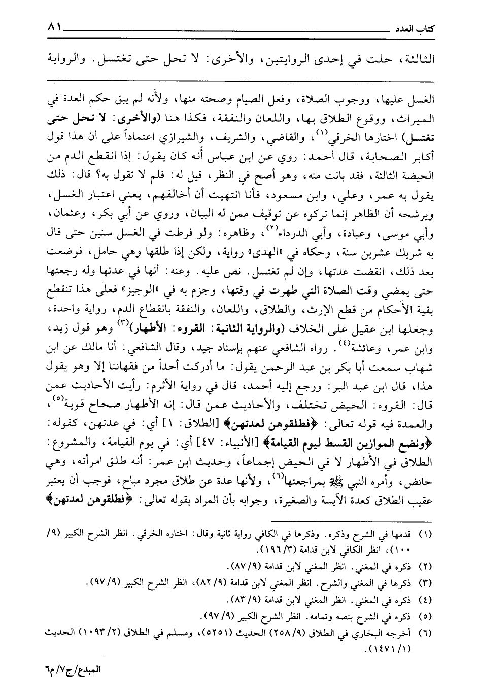 ـــــــــــــــــــــــــــــQالْغُسْلِ عَلَيْهَا وَوُجُوبِ الصَّلَاةِ وَفِعْلِ الصِّيَامِ وَصِحَّتِهِ مِنْهَا، وَلِأَنَّهُ لَمْ يَبْقَ حُكْمُ الْعِدَّةِ فِي الْمِيرَاثِ وَوُقُوعُ الطَّلَاقِ بِهَا، وَاللِّعَانِ، وَالنَّفَقَةِ، فَكَذَا هُنَا (وَالْأُخْرَى لَا تَحِلُّ حَتَّى تَغْتَسِلَ) اخْتَارَهَا الْخِرَقِيُّ، وَالْقَاضِي، وَالشَّرِيفُ، وَالشِّيرَازِيُّ اعْتِمَادًا عَلَى أَنَّ هَذَا قَوْلُ أَكَابِرِ الصَّحَابَةِ. قَالَ أَحْمَدُ: رُوِيَ عَنِ ابْنِ عَبَّاسٍ أَنَّهُ كَانَ يَقُولُ: إِذَا انْقَطَعَ الدَّمُ مِنَ الْحَيْضَةِ الثَّالِثَةِ فَقَدْ بَانَتْ مِنْهُ، وَهُوَ أَصَحُّ فِي النَّظَرِ. قِيلَ لَهُ: فَلِمَ لَا تَقُولُ بِهِ؛ قَالَ: ذَلِكَ يَقُولُ بِهِ عُمَرُ وَعَلِيٌّ، وَابْنُ مَسْعُودٍ، فَأَنَا انْتَهَيْتُ أَنْ أُخَالِفَهُمْ، يَعْنِي: اعْتِبَارَ الْغُسْلِ وَيُرَشِّحُهُ أَنَّ الظَّاهِرَ إِنَّمَا تَرَكُوهُ عَنْ تَوْقِيفٍ مِمَّنْ لَهُ الْبَيَانُ. وَرُوِيَ عَنْ أَبِي بَكْرٍ وَعُثْمَانَ وَأَبِي مُوسَى وَعُبَادَةَ وَأَبِي الدَّرْدَاءِ. وَظَاهِرُهُ وَلَوْ فَرَّطْتَ فِي الْغُسْلِ سِنِينَ حَتَّى قَالَ بِهِ شَرِيكٌ عِشْرِينَ سَنَةً. وَحَكَاهُ فِي " الْهَدى " رِوَايَةً، وَلَكِنْ إِذَا طَلَّقَهَا، وَهِيَ حَامِلٌ فَوَضَعَتْ بَعْدَ ذَلِكَ، انْقَضَتْ عِدَّتُهَا، وَإِنْ لَمْ تَغْتَسِلْ. نَصَّ عَلَيْهِ. وَعَنْهُ: أَنَّهَا فِي عِدَّتِهَا وَلَهُ رَجْعَتُهَا حَتَّى يَمْضِيَ وَقْتُ الصَّلَاةِ الَّتِي طَهُرَتْ فِي وَقْتِهَا، وَجَزَمَ بِهِ فِي " الْوَجِيزِ "، فَعَلَى هَذَا تَنْقَطِعُ بَقِيَّةُ الْأَحْكَامِ مِنْ قَطْعِ الْإِرْثِ، وَالطَّلَاقِ، وَاللِّعَانِ، وَالنَّفَقَةِ بِانْقِطَاعِ الدَّمِ. رِوَايَةً وَاحِدَةً، وَجَعَلَهَا ابْنُ عَقِيلٍ عَلَى الْخِلَافِ. (وَالرِّوَايَةُ الثَّانِيَةُ: الْقُرُوءُ الْأَطْهَارُ) وَهُوَ قَوْلُ زَيْدٍ، وَابْنِ عُمَرَ وَعَائِشَةَ. رَوَاهُ الشَّافِعِيُّ عَنْهُمْ بِإِسْنَادٍ جَيِّدٍ. وَقَالَ الشَّافِعِيُّ: أَنَا مَالِكٌ، عَنِ ابْنِ شِهَابٍ، سَمِعْتُ أَبَا بَكْرِ بْنَ عَبْدِ الرَّحْمَنِ يَقُولُ: مَا أَدْرَكْتُ أَحَدًا مِنْ فُقَهَائِنَا إِلَّا وَهُوَ يَقُولُ هَذَا. قَالَ ابْنُ عَبْدِ الْبَرِّ: وَرَجَعَ إِلَيْهِ أَحْمَدُ، قَالَ فِي رِوَايَةِ الْأَثْرَمِ: رَأَيْتُ الْأَحَادِيثَ عَمَّنْ قَالَ الْقُرُوءُ الْحِيَضُ تَخْتَلِفُ، وَالْأَحَادِيثُ عَمَّنْ قَالَ: إِنَّهُ الْأَطْهَارُ صِحَاحٌ قَوِيَّةٌ. وَالْعُمْدَةُ فِيهِ قَوْله تَعَالَى: {فَطَلِّقُوهُنَّ لِعِدَّتِهِنَّ} [الطلاق: 1] أَيْ فِي عِدَّتِهِنَّ كَقَوْلِهِ: {وَنَضَعُ الْمَوَازِينَ الْقِسْطَ لِيَوْمِ الْقِيَامَةِ} [الأنبياء: 47] أَيْ: فِي يَوْمِ الْقِيَامَةِ. وَالْمَشْرُوعُ الطَّلَاقُ فِي الْأَطْهَارِ، لَا فِي الْحَيْضِ إِجْمَاعًا، «وَحَدِيثَ ابْنِ عُمَرَ أَنَّهُ طَلَّقَ امْرَأَتَهُ، وَهِيَ حَائِضٌ وَأَمَرَهُ النَّبِيُّ - صَلَّى اللَّهُ عَلَيْهِ وَسَلَّمَ - بِمُرَاجَعَتِهَا» ، وَلِأَنَّهَا عِدَّةٌ عَنْ طَلَاقٍ مُجَرَّدٍ مُبَاحٍ فَوَجَبَ أَنْ يُعْتَبَرَ عُقَيْبَ الطَّلَاقِ كَعِدَّةِ الْآيِسَةِ، وَالصَّغِيرَةِ. وَجَوَابُهُ: بِأَنَّ الْمُرَادَ بِقَوْلِهِ تَعَالَى: {فَطَلِّقُوهُنَّ لِعِدَّتِهِنَّ} [الطلاق: 1]