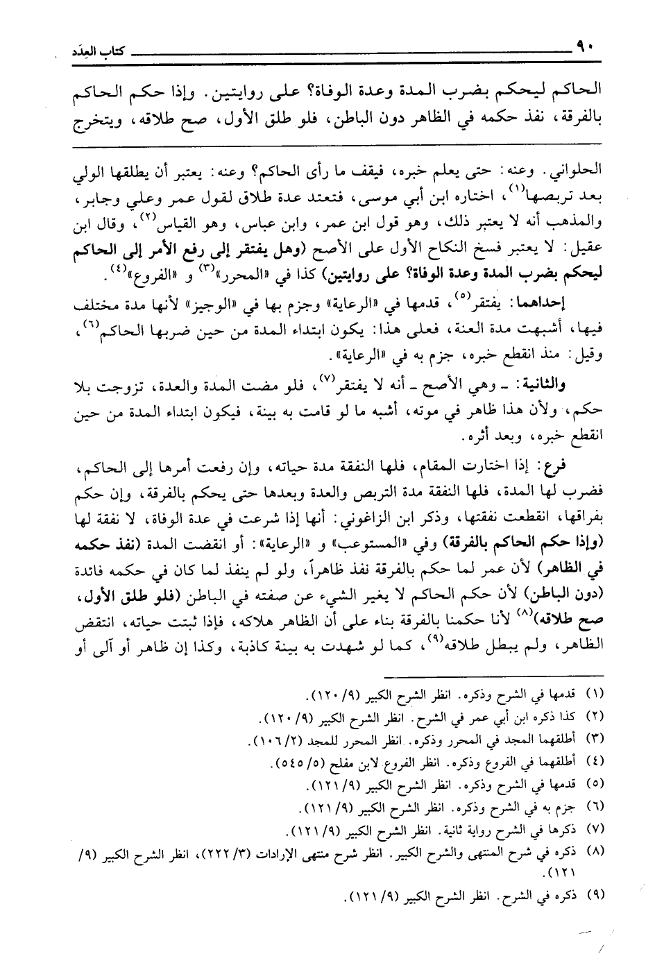الْحَاكِمِ لِيَحْكُمَ بِضَرْبِ الْمُدَّةِ وَعِدَّةِ الْوَفَاةِ؛ عَلَى رِوَايَتَيْنِ. وَإِذَا حَكَمَ الْحَاكِمُ بِالْفُرْقَةِ نَفَذَ حُكْمُهُ فِي الظَّاهِرِ دُونَ الْبَاطِنِ فَلَوْ طَلَّقَ الْأَوَّلُ صَحَّ طَلَاقُهُ وَيَتَخَرَّجُ