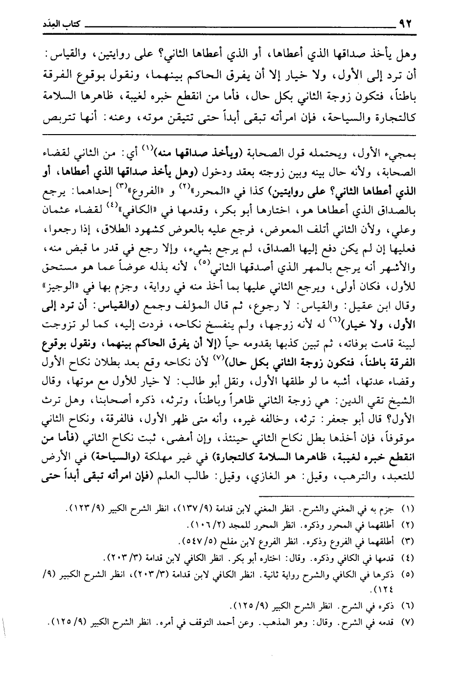 وَهَلْ يَأْخُذُ صَدَاقَهَا الَّذِي أَعْطَاهَا أَوِ الَّذِي أَعْطَاهَا الثَّانِي؛ عَلَى رِوَايَتَيْنِ، وَالْقِيَاسُ أَنْ تُرَدَّ إِلَى الْأَوَّلِ. وَلَا خِيَارَ إِلَّا أَنْ يُفَرِّقَ الْحَاكِمُ بَيْنَهُمَا، وَنَقُولُ بِوُقُوعِ الْفُرْقَةِ بَاطِنًا فَتَكُونُ زَوْجَةَ الثَّانِي بِكُلِّ حَالٍ، فَأَمَّا مَنِ انْقَطَعَ خَبَرُهُ لِغَيْبَةٍ ظَاهِرُهَا السَّلَامَةُ كَالتِّجَارَةِ وَالسِّيَاحَةِ، فَإِنَّ امْرَأَتَهُ تَبْقَى أَبَدًا حَتَّى تَتَيَقَّنَ مَوْتَهُ. وَعَنْهُ: أَنَّهَا تَتَرَبَّصُ