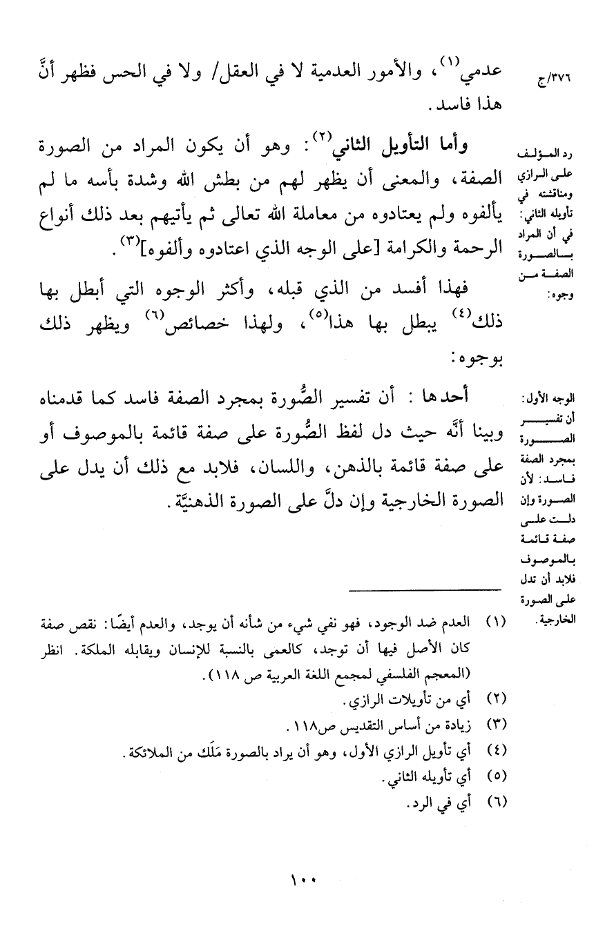 عدمي والأمور العدمية لا في العقل ولا في الحس فظهر أنَّ هذا فاسد وأما التأويل الثاني وهو أن يكون المراد من الصورة الصفة والمعنى أن يظهر لهم من بطش الله وشدة بأسه ما لم يألفوه ولم يعتادوه من معاملة الله تعالى ثم يأتيهم بعد ذلك أنواع الرحمة والكرامة على الوجه الذي اعتادوه وألفوه فهذا أفسد من الذي قبله وأكثر الوجوه التي أبطل بها ذلك يبطل بها هذا ولهذا خصائص ويظهر ذلك بوجوه أحدها أن تفسير الصُّورة بمجرد الصفة فاسد كما قدمناه وبينا أنَّه حيث دل لفظ الصُّورة على صفة قائمة بالموصوف أو على صفة قائمة بالذهن واللسان فلابد مع ذلك أن يدل على الصورة الخارجية وإن دلَّ على الصورة الذهنيَّة