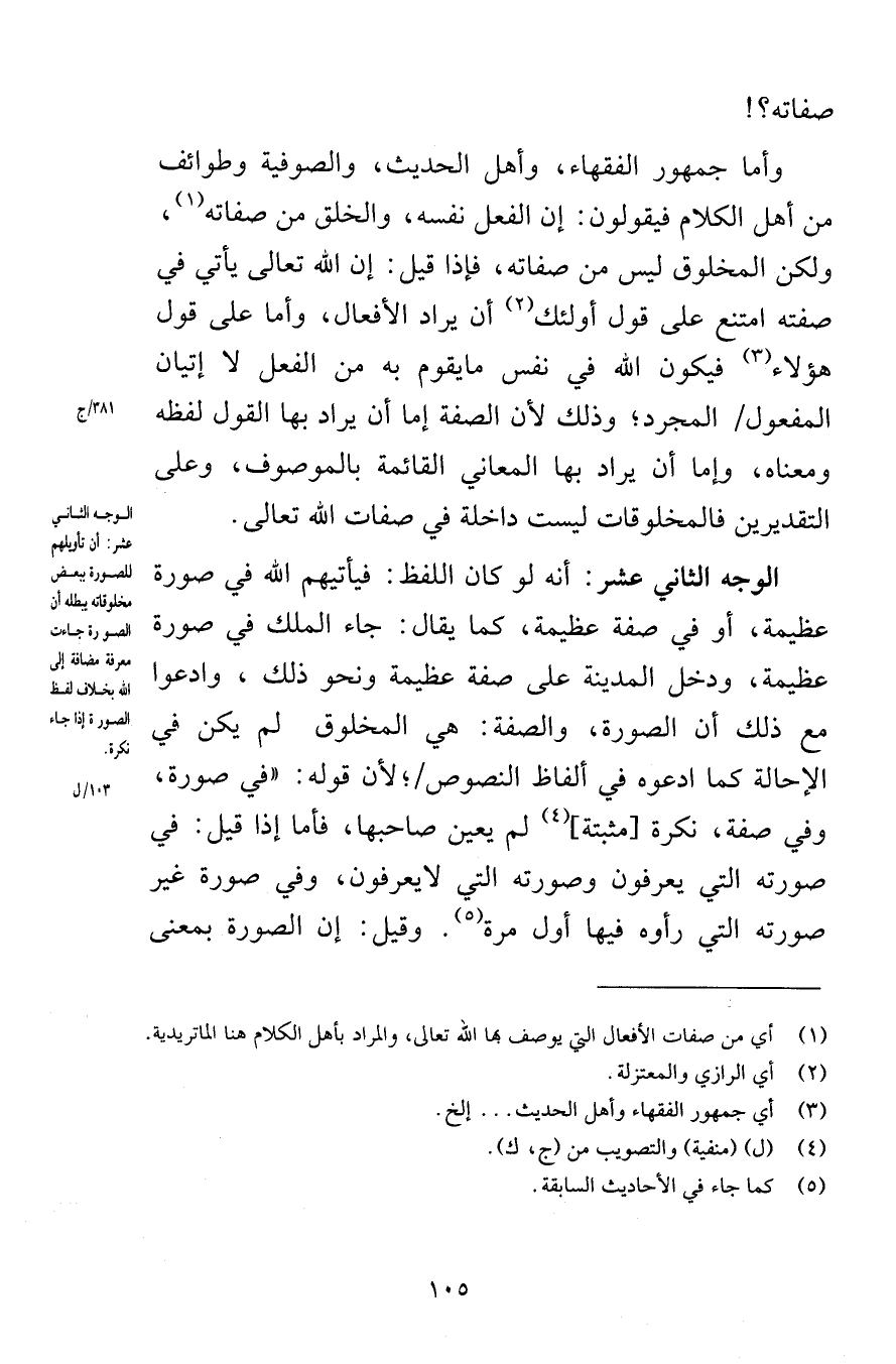 صفاته وأما جمهور الفقهاء وأهل الحديث والصوفية وطوائف من أهل الكلام فيقولون إن الفعل نفسه والخلق من صفاته ولكن المخلوق ليس من صفاته فإذا قيل إن الله تعالى يأتي في صفته امتنع على قول أولئك أن يراد الأفعال وأما على قول هؤلاء فيكون الله في نفس ما يقوم به من الفعل لا إتيان المفعول المجرد وذلك لأن الصفة إما أن يراد بها القول لفظه ومعناه وإما أن يراد بها المعاني القائمة بالموصوف وعلى التقديرين فالمخلوقات ليست داخلة في صفات الله تعالى الوجه الثاني عشر أنه لو كان اللفظ فيأتيهم الله في صورة عظيمة أو في صفة عظيمة كما يقال جاء الملك في صورة عظيمة ودخل المدينة على صفة عظيمة ونحو ذلك وادعوا مع ذلك أن الصورة والصفة هي المخلوق لم يكن في الإحالة كما ادعوه في ألفاظ النصوص لأن قوله في صورة وفي صفة نكرة مثبتة لم يعين صاحبها فأما إذا قيل في صورته التي يعرفون وصورته لا يعرفون وفي صورة غير صورته التي رأوه فيها أول مرة وقيل عن الصورة بمعنى