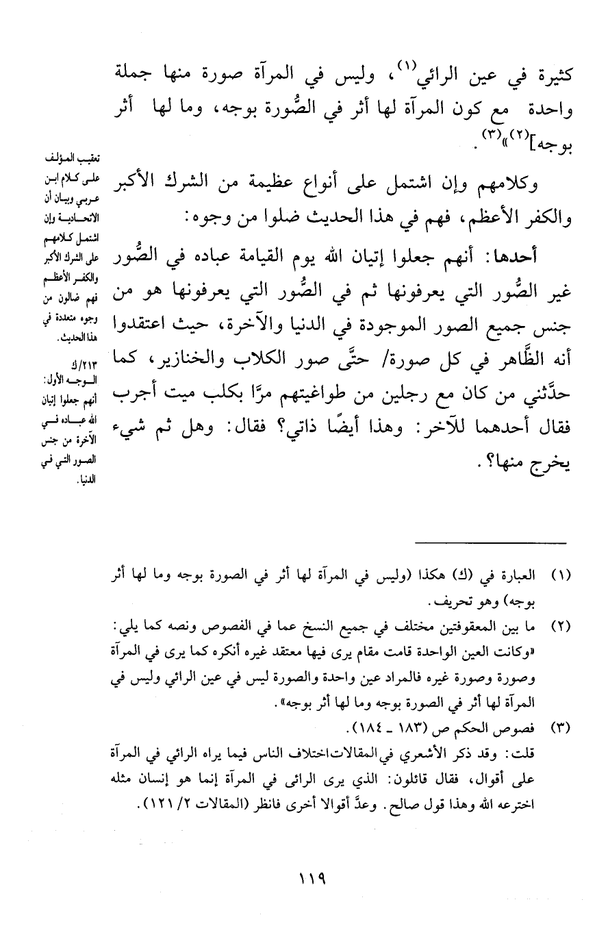 كثيرة في عين الرائي وليس في المرآة صورة منها جملة واحدة مع كون المرآة لها أثر في الصُّورة بوجه وما لها أثر بوجه وكلامهم وإن اشتمل على أنواع عظيمة من الشرك الأكبر والكفر الأعظم فهم في هذا الحديث ضلوا من وجوه أحدها أنهم جعلوا إتيان الله يوم القيامة عباده في الصُّور غير الصُّور التي يعرفونها ثم في الصُّور التي يعرفونها هو من جنس جميع الصور الموجودة في الدنيا والآخرة حيث اعتقدوا أنه الظَّاهر في كل صورة حتَّى صور الكلاب والخنازير كما حدَّثني من كلن مع رجلين من طواغيتهم مرَّا بكلب ميت أجرب فقال أحدهما للآخر وهذا أيضًا ذاتي فقال وهل ثم شيء يخرج منها