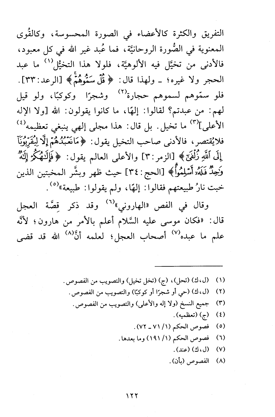 التفريق والكثرة كالأعضاء في الصورة المحسوسة وكالقُوى المعنوية في الصُّورة الروحانيَّة فما عُبد غير الله في كل معبود فالأدنى من تخيَّل فيه الألوهيَّة فلولا هذا التخيُّل ما عبد الحجر ولا غيره ولهذا قال قُلْ سَمُّوهُمْ [الرعد 33] فلو سمّوهم لسموهم حجارة وشجرًا وكوكبًا ولو قيل لهم من عبدتم لقالوا إلهًا ما كانوا يقولون الله ولا الإله الأعلى ما تخيل بل قال هذا مجلى إلهي ينبغي تعظيمه فلا يُقتصر فالأدنى صاحب التخيل يقول مَا نَعْبُدُهُمْ إِلَّا لِيُقَرِّبُونَا إِلَى اللَّهِ زُلْفَى [الزمر 3] والأعلى العالم يقول فَإِلَهُكُمْ إِلَهٌ وَاحِدٌ فَلَهُ أَسْلِمُوا [الحج 34] حيث ظهر وبشَّر المخبتين الذين خبت نارُ طبيعتهم فقالوا إلهًا ولم يقولوا طبيعة وقال في الفص الهاروني وقد ذكر قِصَّة العجل قال فكان موسى عليه السَّلام أعلم بالأمر من هارون لأنَّه علم ما عبده أصحاب العجل لعلمه أنَّ الله قد قضى