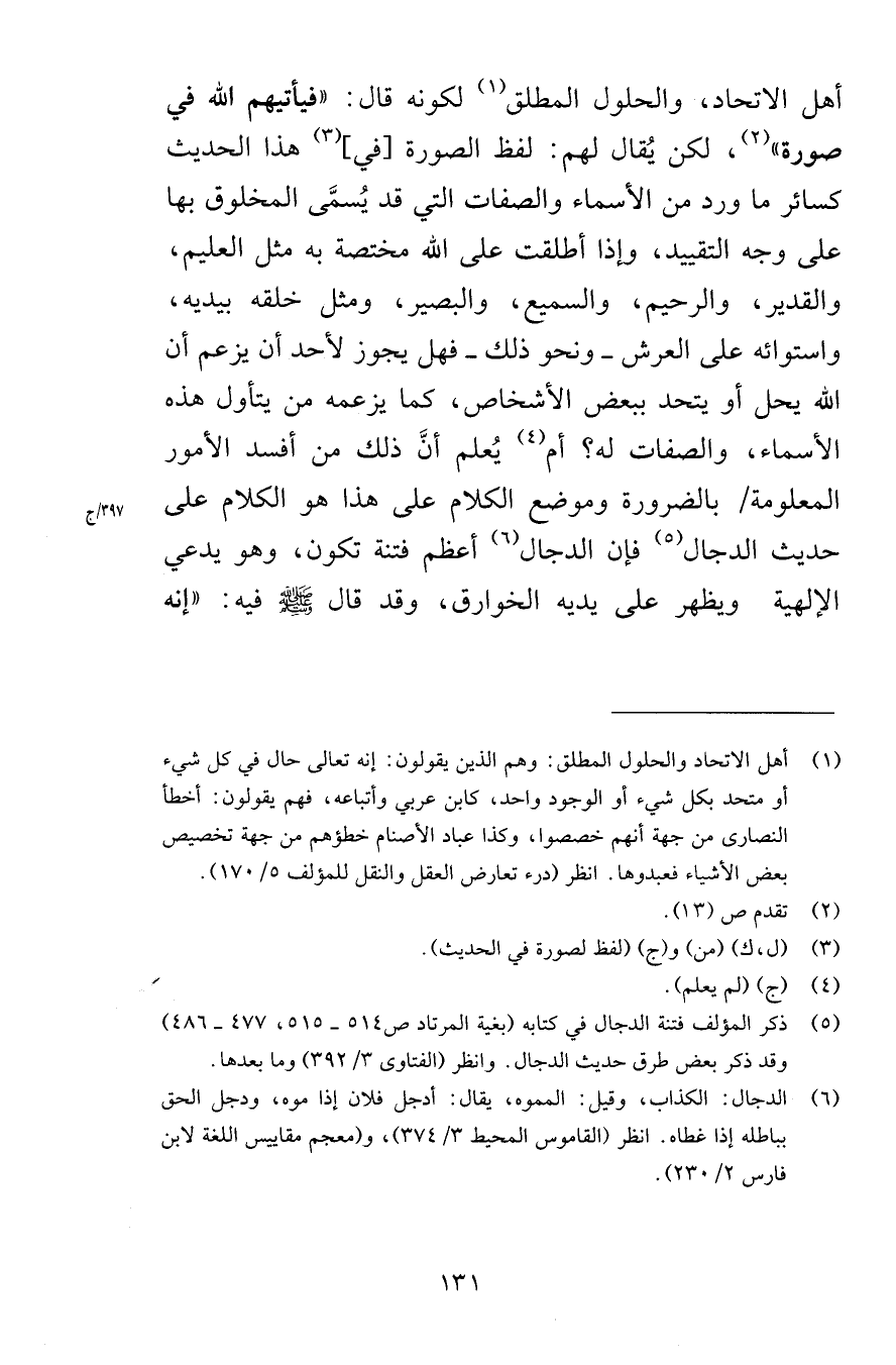 أهل الاتحاد والحلول المطلق لكونه قال فيأتيهم الله في صورة لكن يُقال لهم لفظ الصورة في هذا الحديث كسائر ما ورد من الأسماء والصفات التي قد يُسمَّى المخلوق بها على وجه التقييد وإذا أطلقت على الله مختصة به مثل العليم والقدير والرحيم والسميع والبصير ومثل خلقه بيديه واستوائه على العرش ونحو ذلك فهل يجوز لأحد أن يزعم أن الله يحل أو يتحد ببعض الأشخاص كما يزعمه من يتأول هذه الأسماء والصفات له أم يُعلم أنَّ ذلك من أفسد الأمور المعلومة بالضرورة وموضع الكلام على هذا هو الكلام على حديث الدجال فإن الدجال أعظم فتنة تكون وهو يدعي الإلهية ويظهر على يديه الخوارق وقد قال صلى الله عليه وسلم فيه إنه