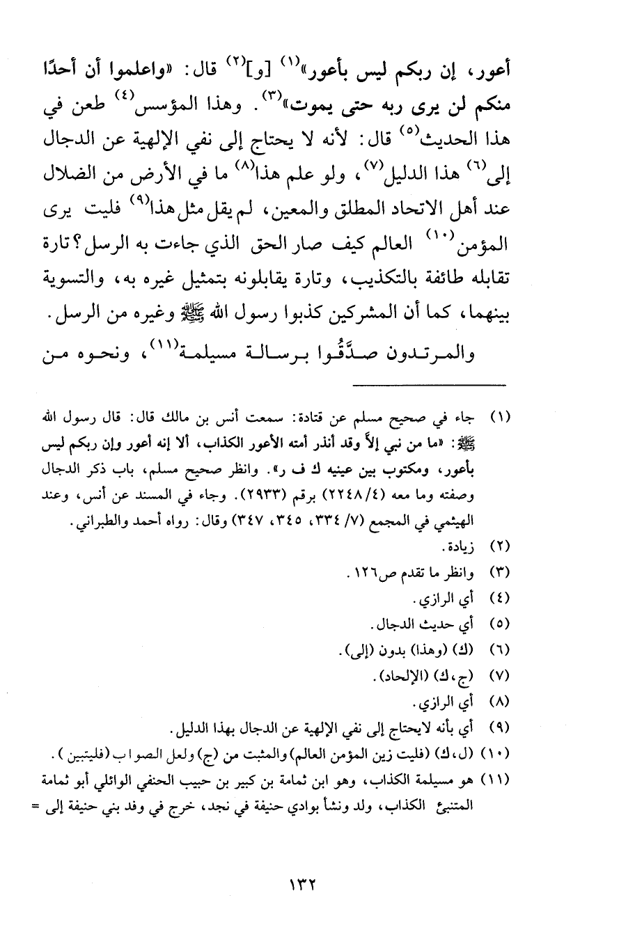 أعور إن ربكم ليس بأعور وقال واعلموا أن أحدًا منكم لن يرى ربه حتى يموت وهذا المؤسس طعن في هذا الحديث قال لأنه لا يحتاج إلى نفي الإلهية عن الدجال إلى هذا الدليل ولو علم هذا ما في الأرض من الضلال عند أهل الاتحاد المطلق والمعين لم يقل مثل هذا فليت يرى المؤمن العالم كيف صار الحق الذي جاءت به الرسل تارة تقابله طائفة بالتكذيب وتارة يقابلونه بتمثيل غيره به والتسوية بينهما كما أن المشركين كذبوا رسول الله صلى الله عليه وسلم وغيره من الرسل والمرتدون صدَّقُوا برسالة مسيلمة ونحوه من