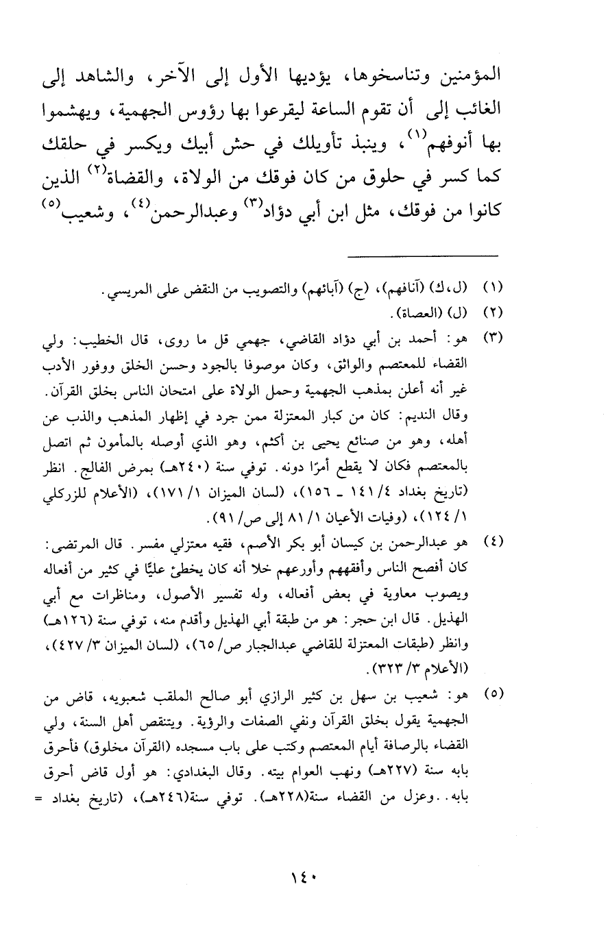 المؤمنين وتناسخوها يؤديها الأول إلى الآخر والشاهد إلى الغائب إلى أن تقوم الساعة ليقرعوا بها رؤوس الجهمية ويهشموا بها أنوفهم وينبذ تأويلك في حش أبيك ويكسر في حلقك كما كسر في حلوق من كان فوقك من الولاة والقضاة الذين كانوا من فوقك مثل ابن أبي دؤاد وعبد الرحمن وشعيب