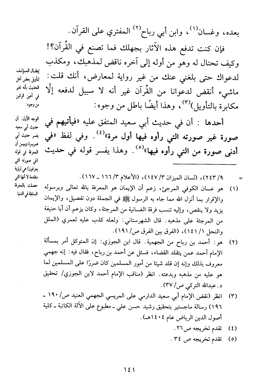 بعده وغسان وابن أبي رباح المفتري على القرآن فإن كنت تدفع هذه الآثار بجهلك فما تصنع في القُرآن وكيف تحتال له وهو من أوله إلى آخره ناقض لمذهبك ومكذب لدعواك حتى بلغني عنك من غير رواية لمعارض أنك قلت ماشيء أنقض لدعوانا من القُرآن غير أنه لا سبيل لدفعه إلاَّ مكابرة بالتأويل وهذا أيضًا باطل من وجوه أحدها أن في حديث أبي سعيد المتفق عليه فيأتيهم في صورة غير صورته التي رأوه فيها أول مرة وفي لفظ في أدنى صورة من التي رأوه فيها وهذا يفسر قوله في حديث