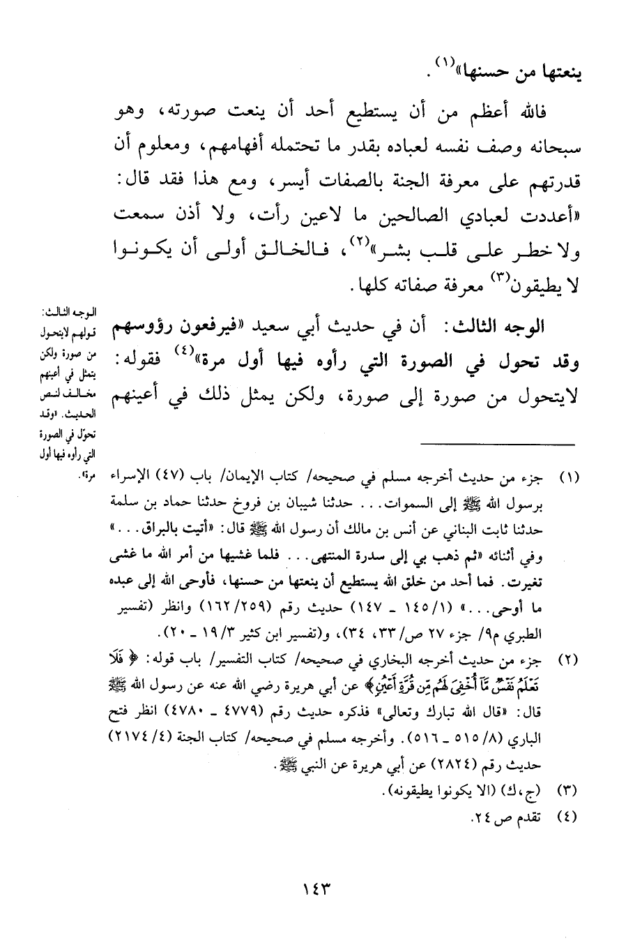 ينعتها من حسنها فالله أعظم من أن يستطيع أحد أن ينعت صورته وهو سبحانه وصف نفسه لعباده بقدر ما تحتمله أفهامهم ومعلوم أن قدرتهم على معرفة الجنة بالصفات أيسر ومع هذا فقد قال أعددت لعبادي الصالحين ما لا عين رأت ولا أذن سمعت ولا خطر على قلب بشر فالخالق أولى أن يكونوا لا يطيقون معرفة صفاته كلها الوجه الثالث أن في حديث أبي سعيد فيرفعون رؤوسهم وقد تحول في الصورة التي رأوه فيها أول مرة فقوله لا يتحول من صورة إلى صورة ولكن يمثل ذلك في أعينهم