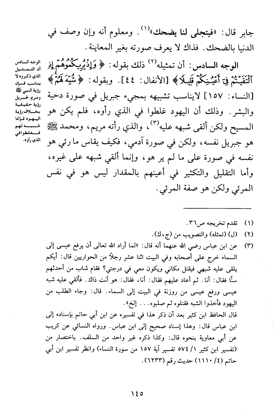 جابر قال فيتجلى لنا يضحك ومعلوم أنه وإن وصف في الدنيا بالضحك فذاك لا يعرف صورته بغير المعاينة الوجه السادس أن تمثيله ذلك بقوله وَإِذْ يُرِيكُمُوهُمْ إِذِ الْتَقَيْتُمْ فِي أَعْيُنِكُمْ قَلِيلًا [الأنفال 44] وبقوله شُبِّهَ لَهُمْ [النساء 157] لا يناسب تشبيهه بمجيء جبريل في صورة دحية والبشر وذلك أن اليهود غلطوا في الذي رأوه فلم يكن هو المسيح ولكن ألقى شبهه عليه والذي رأته مريم ومحمد صلى الله عليه وسلم هو جبريل نفسه ولكن في صورة آدمي فكيف يقاس ما رئي هو نفسه في صورة على ما لم يره هو وإنما ألقي شبهه على غيره وأما التقليل والتكثير في أعينهم بالمقدار ليس هو في نفس المرئي ولكن هو صفة المرئي