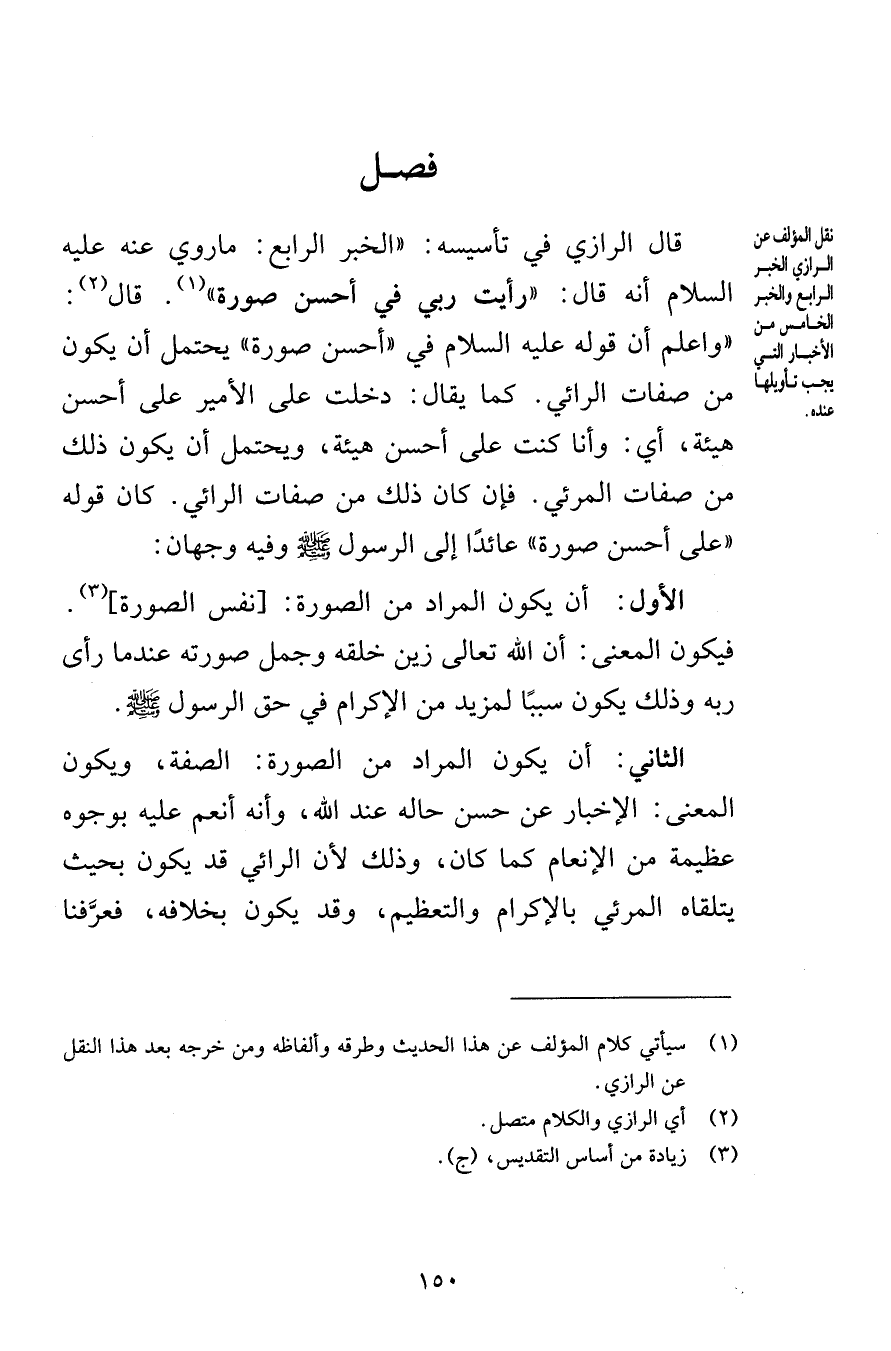 فصل قال الرازي في تأسيسه الخبر الرابع ماروي عنه عليه السلام أنه قال رأيت ربي في أحسن صورة قال واعلم أن قوله عليه السلام في أحسن صورة يحتمل أن يكون من صفات الرائي كما يقال دخلت على الأمير على أحسن هيئة أي وأنا كنت على أحسن هيئة ويحتمل أن يكون ذلك من صفات المرئي فإن كان ذلك من صفات الرائي كان قوله على أحسن صورة عائدًا إلى الرسول صلى الله عليه وسلم وفيه وجهان الأول أن يكون المراد من الصورة نفس الصورة فيكون المعنى أن الله تعالى زين خلقه وجمل صورته عندما رأى ربه وذلك يكون سببًا لمزيد من الإكرام في حق الرسول صلى الله عليه وسلم الثاني أن يكون المراد من الصورة الصفة ويكون المعنى الإخبار عن حسن حاله عند الله وأنه أنعم عليه بوجوه عظيمة من الإنعام كما كان وذلك لأن الرائي قد يكون بحيث يتلقاه المرئي بالإكرام والتعظيم وقد يكون بخلافه فعرَّفنا