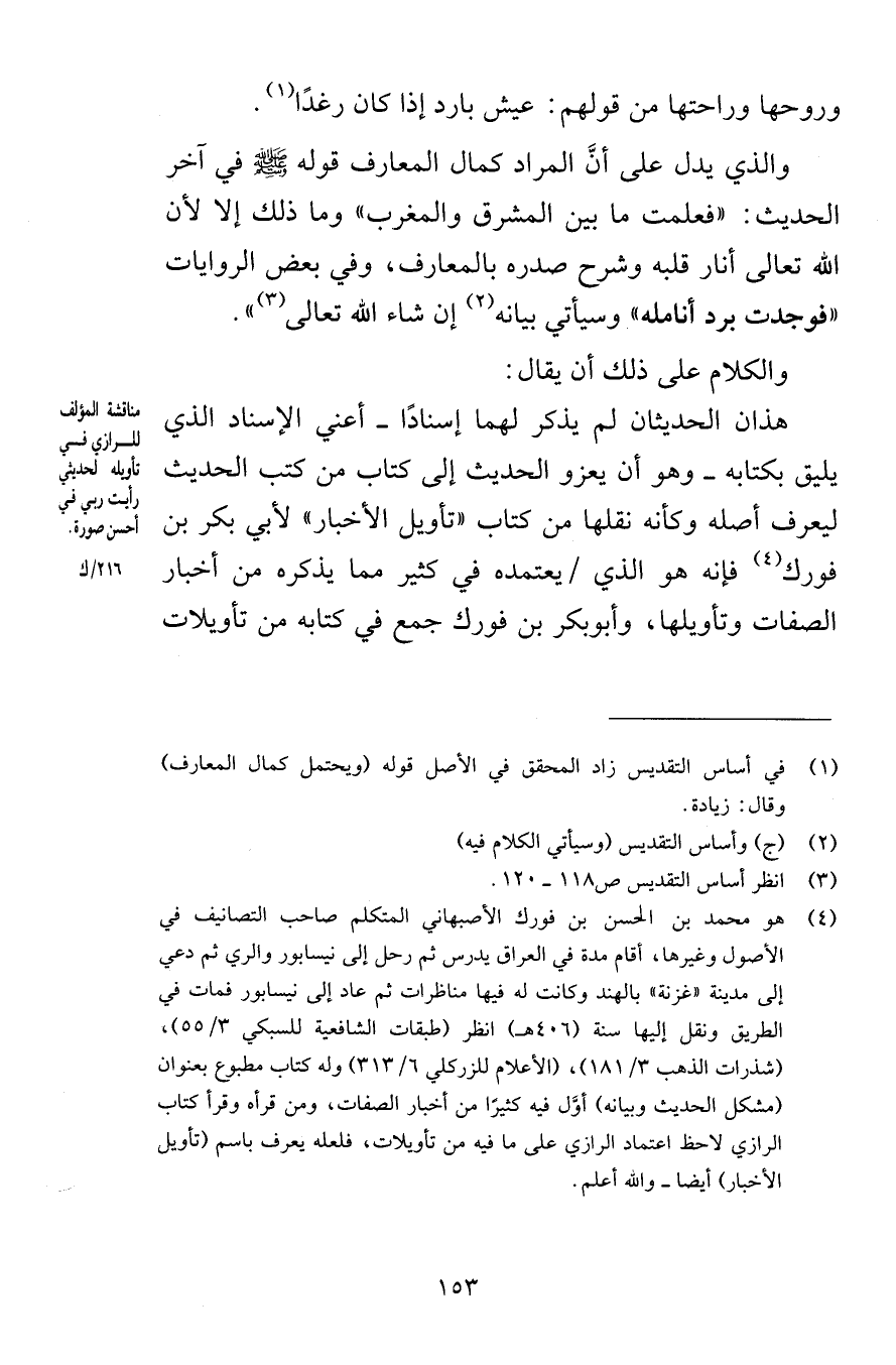 وروحها وراحتها من قولهم عيش بارد إذا كان رغدًا والذي يدل على أنَّ المراد كمال المعارف قوله صلى الله عليه وسلم في آخر الحديث فعلمت ما بين المشرق والمغرب وما ذلك إلا لأن الله تعالى أنار قلبه وشرح صدره بالمعارف وفي بعض الروايات فوجدت برد أنامله وسيأتي بيانه إن شاء الله تعالى والكلام على ذلك أن يقال هذان الحديثان لم يذكر لهما إسنادًا أعني الإسناد الذي يليق بكتابه وهو أن يعزو الحديث إلى كتاب من كتب الحديث ليعرف أصله وكأنه نقلها من كتاب تأويل الأخبار لأبي بكر بن فورك فإنه هو الذي يعتمده في كثير مما يذكره من أخبار الصفات وتأويلها وأبوبكر بن فورك جمع في كتابه من تأويلات
