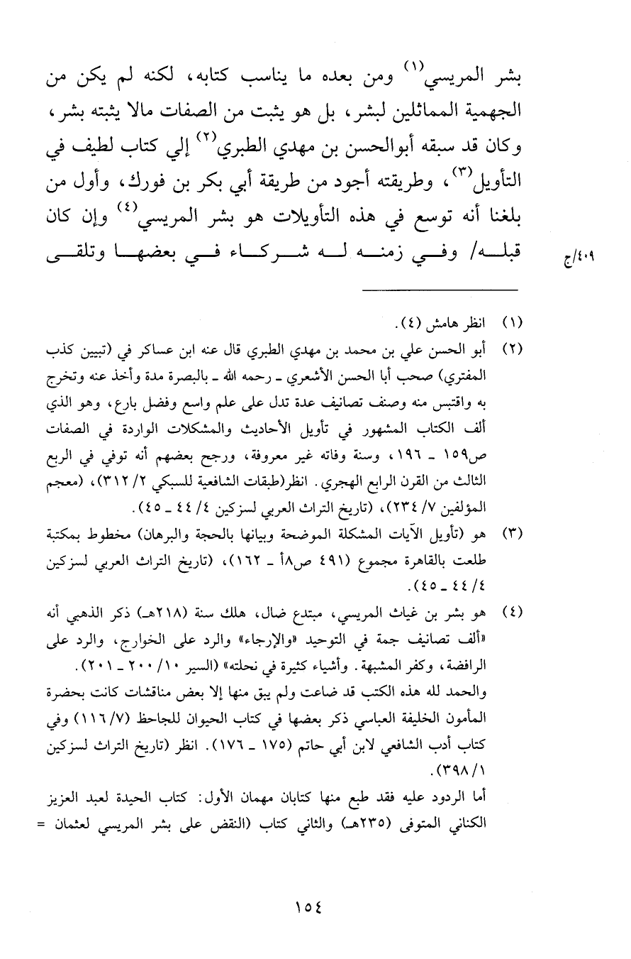 بشر المريسي ومن بعده ما يناسب كتابه لكنه لم يكن من الجهمية المماثلين لبشر بل هو يثبت من الصفات ما لا يثبته بشر وكان قد سبقه أبوالحسن بن مهدي الطبري إلى كتاب لطيف في التأويل وطريقته أجود من طريقة أبي بكر بن فورك وأول مكن بلغنا أنه توسع في هذه التأويلات هو بشر المريسي وإن كان قبله وفي ومنه له شركاء في بعضها وتلقى