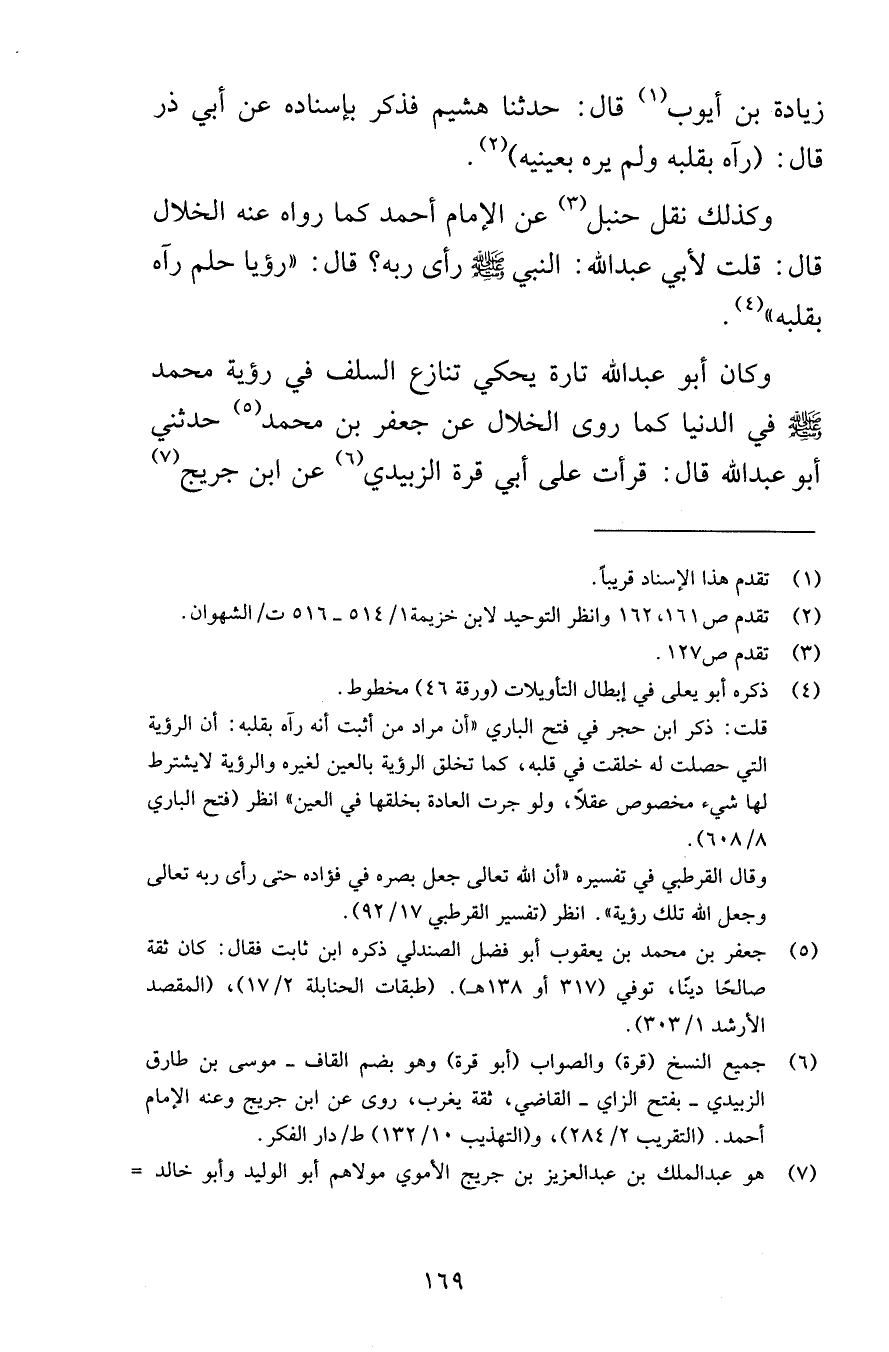 زيادة بن أيوب قال حدثنا هشيم فذكر بإسناده عن أبي ذر قال رآه بقلبه ولم يره بعينه وكذلك نقل حنبل عن الإمام أحمد كما رواه عنه الخلال قال قلت لأبي عبد الله النبي صلى الله عليه وسلم رأى ربه قال رؤيا حلم رآه بقلبه وكان أبو عبد الله تارة يحكي تنازع السلف في رؤية محمد صلى الله عليه وسلم في الدنيا كما روى الخلال عن جعفر بن محمد حدثني أبو عبد الله قال قرأت على أبي قرة الزبيدي عن أبي جريج