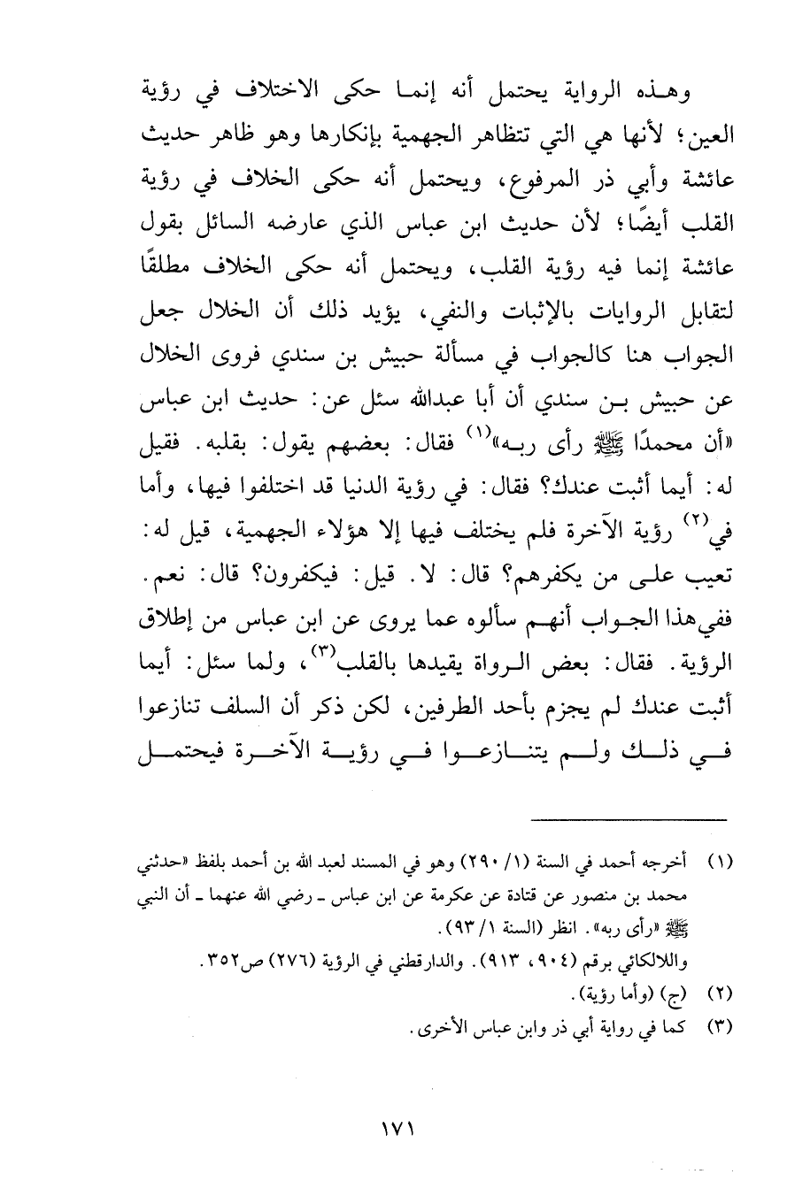 وهذه الرواية يحتمل أنه إنما حكى الاختلاف في رؤية العين لأنها هي التي تتظاهر الجهمية بإنكارها وهو ظاهر حديث عائشة وأبي ذر المرفوع ويحتمل أنه حكى الخلاف في رؤية القلب أيضًا لأن حديث ابن عباس الذي عارضه السائل بقول عائشة إنما فيه رؤية القلب ويحتمل أنه حكى الخلاف مطلقًا لتقابل الروايات بالإثبات والنفي يؤيد ذلك أن الخلال جعل الجواب هنا كالجواب في مسألة حبيش بن سندي فروى الخلال عن حبيش بن سندي أن أبا عبد الله سئل عن حديث ابن عباس أن محمدًا صلى الله عليه وسلم رأى ربه فقال بعضهم يقول بقلبه فقيل له أيما أثبت عندك فقال في رؤية الدنيا قد اختلفوا فيها وأما في رؤية الآخرة فلم يختلف فيها إلا هؤلاء الجهمية قيل له تعيب على من يكفرهم قال لا قيل فيكفرون قال نعم ففي هذا الجواب أنهم سألوه عما يروى عن ابن عباس من إطلاق الرؤية فقال بعض الرواة يقيدها بالقلب ولما سئل أيما أثبت عندك لم يجزم بأحد الطرفين لكن ذكر أن السلف تنازعوا في ذلك ولم يتنازعوا في رؤية الآخرة فيحتمل