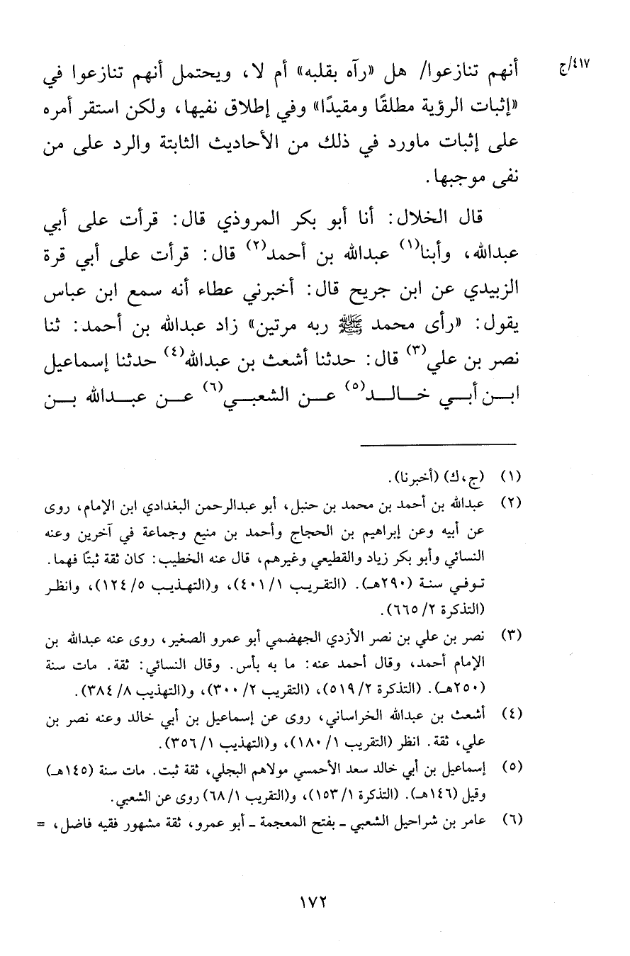 أنهم تنازعوا هل رآه بقلبه أم لا ويحتمل أنهم تنازعوا في إثبات الرؤية مطلقًا ومقيدًا وفي إطلاق نفيها ولكن استقر أمره على إثبات ماورد في ذلك من الأحاديث الثابتة والرد على من نفى موجبها قال الخلال أنا أبو بكر المروذي قال قرأت على أبي عبد الله وأبنا عبد الله بن أحمد قال قرأت على أبي قرة الزبيدي عن ابن جريح قال أخبرني عطاء أنه سمع ابن عباس يقول رأى محمد صلى الله عليه وسلم ربه مرتين زاد عبد الله بن أحمد ثنا نصر بن علي قال حدثنا أشعث بن عبد الله حدثنا إسماعيل ابن أبي خالد عن الشعبي عن عبد الله بن