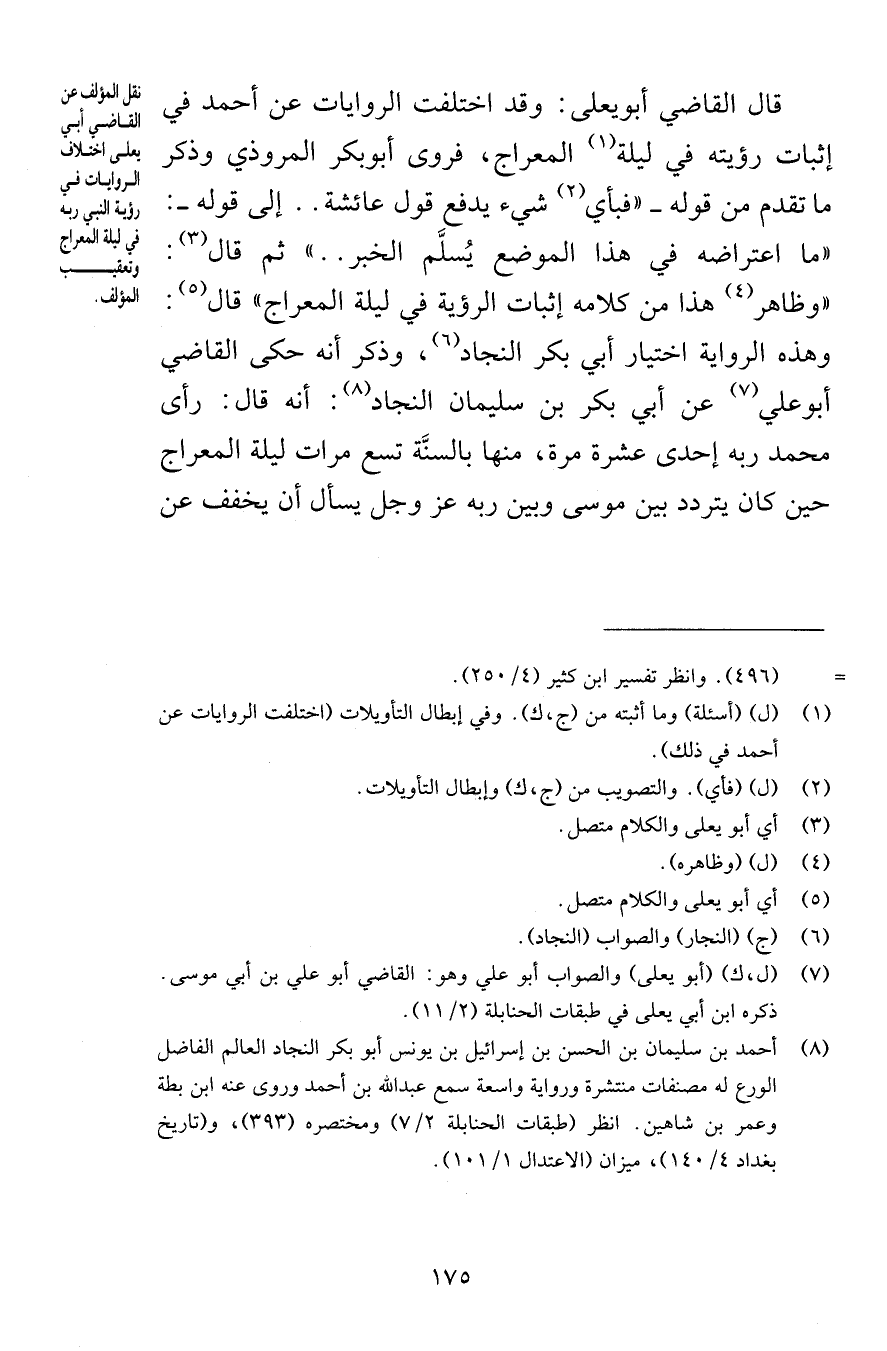قال القاضي أبو يعلى وقد اختلفت الروايات عن أحمد في إثبات رؤيته في ليلة المعراج قروى أبوبكر المروذي وذكر ما تقدم من قوله فبأي شيء يدفع قول عائشة إلى قوله ما اعتراضه في هذا الموضع يُسلَّم الخبر ثم قال وظاهر هذا من كلامه إثبات الرؤية في ليلة المعراج قال وهذه الرواية اختيار أبي بكر النجاد وذكر أنه حكى القاضي أبو علي عن أبي بكر بن سليمان النجاد أنه قال رأى محمد ربه إحدى عشرة مرة منها بالسنَّة تسع مرات ليلة المعراج حين كان يتردد بين موسى وبين ربه عز وجل يسأل أن يخفف عن