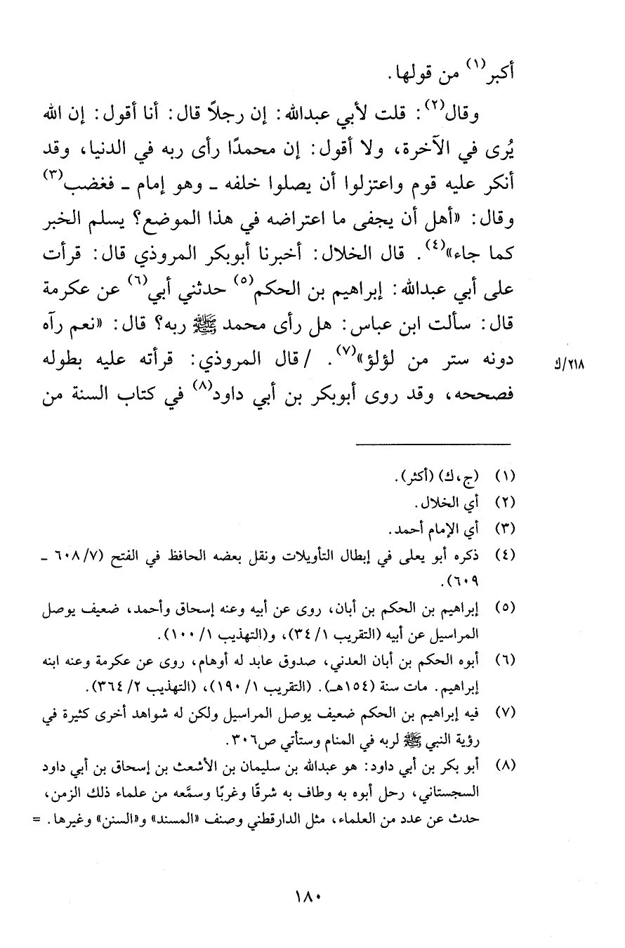 أكبر من قولها وقال قلت لأبي عبد الله إن رجلاً قال أنا أقول إن الله يُرى في الآخرة ولا أقول إن محمدًا رأى ربه في الدنيا وقد أنكر عليه قوم واعتزلوا أن يصلوا خلفه وهو غمام فغضب وقال أهل أن يجفى ما اعتراضه في هذا الموضع يسلم الخبر كما جاء قال الخلال أخبرنا أبوبكر المروذي قال قرأت على أبي عبد الله إبراهيم بن الحكم حدثني أبي عن عكرمة قال سألت ابن عباس عل رأى محمد صلى الله عليه وسلم ربه قال نعم رآه دون ستر من لؤلؤ قال المروذي قرأته عليه بطوله فصححه وقد روى أبوبكر بن أبي داود في كتاب السنة من