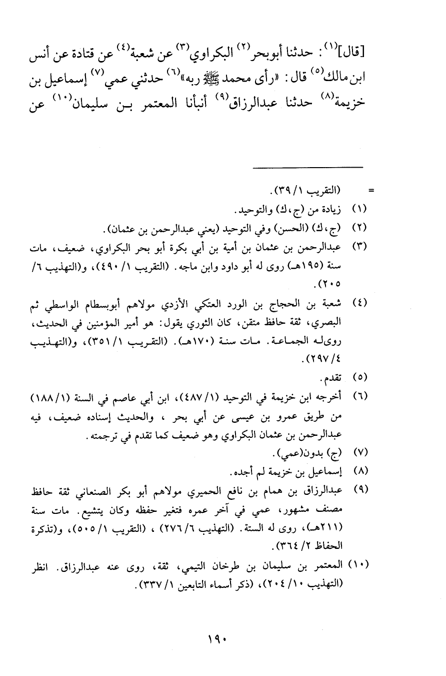 قال حدثنا أبوبحر البكراوي عن شعبة عن قتادة عن أنس ابن مالك قال رأى محمد صلى الله عليه وسلم ربه حدثني عمي إسماعيل بن خزيمة حدثنا عبد الرزاق أنبأنا المعتمر بن سليمان عن