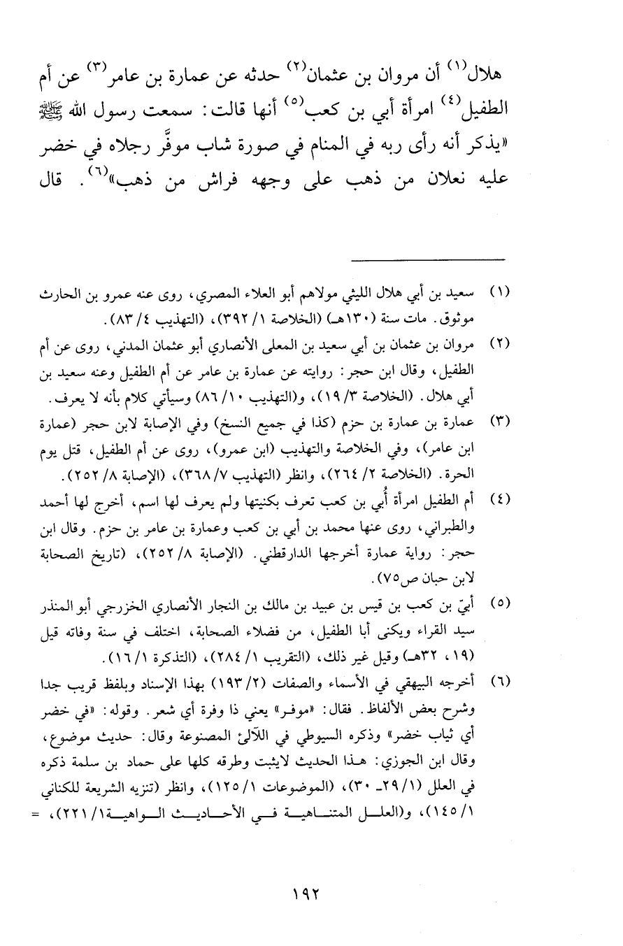 هلال أن مروان بن عثمان حدثه عن عمارة بن عامر عن أم الطفيل امرأة أبي بن كعب أنها قالت سمعت رسول الله صلى الله عليه وسلم يذكر أنه رأى ربه في المنام في صورة شاب موفَّر رجلاه في خضر عليه نعلان من ذهب على وجهه فراش من ذهب قال
