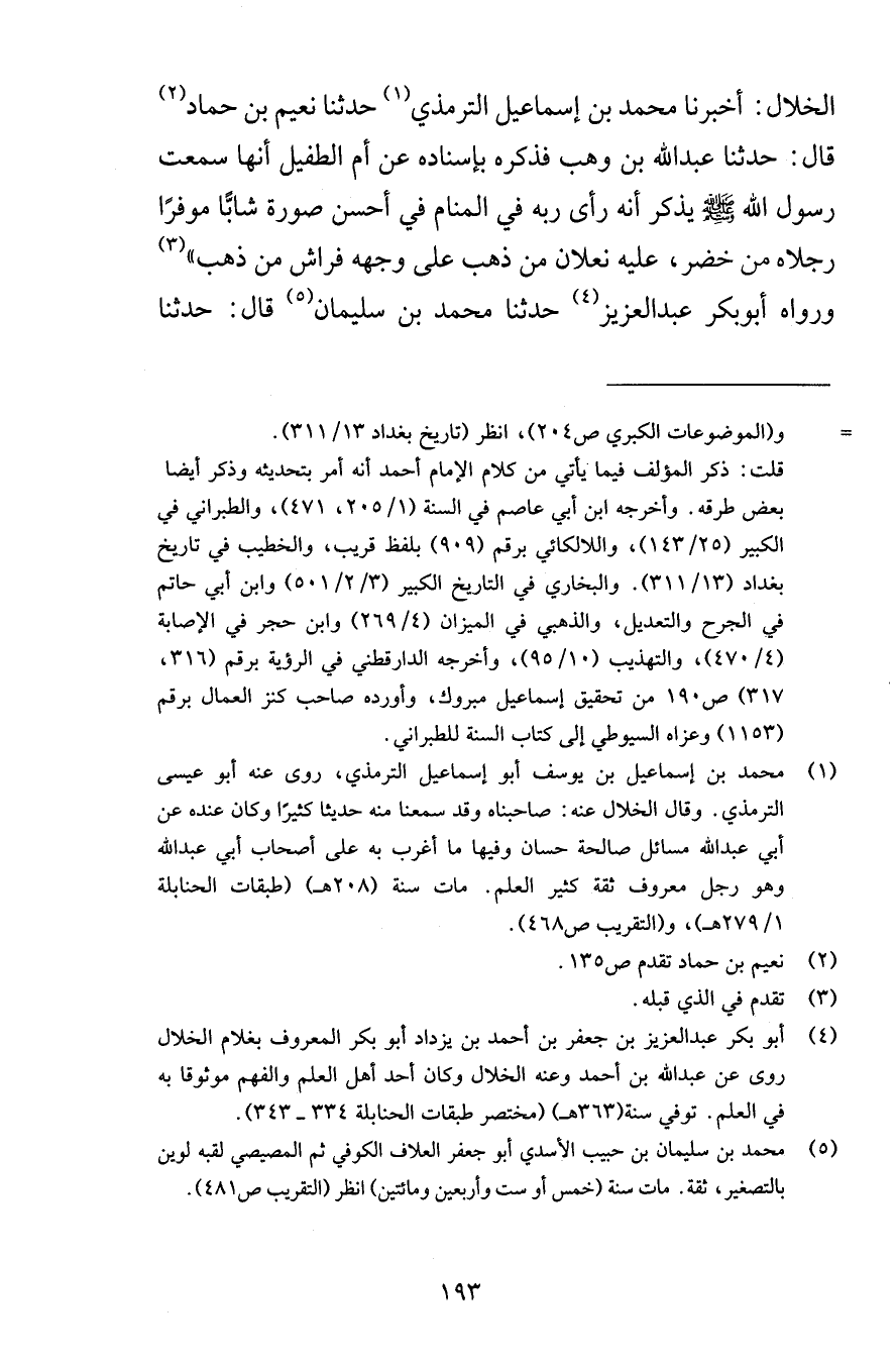 الخلال أخبرنا محمد بن إسماعيل الترمذي حدثنا نعيم بن حماد قال حدثنا عبد الله بن وهب فذكره بإسناده عن أم الطفيل أنها سمعت رسول الله صلى الله عليه وسلم يذكر أنه رأى ربه في المنام في أحسن صورة شابًّا موفرًا رجلاه من خضر عليه نعلان من ذهب على وجهه فراش من ذهب ورواه أبوبكر عبد العزيز حدثنا محمد بن سليمان قال حدثنا