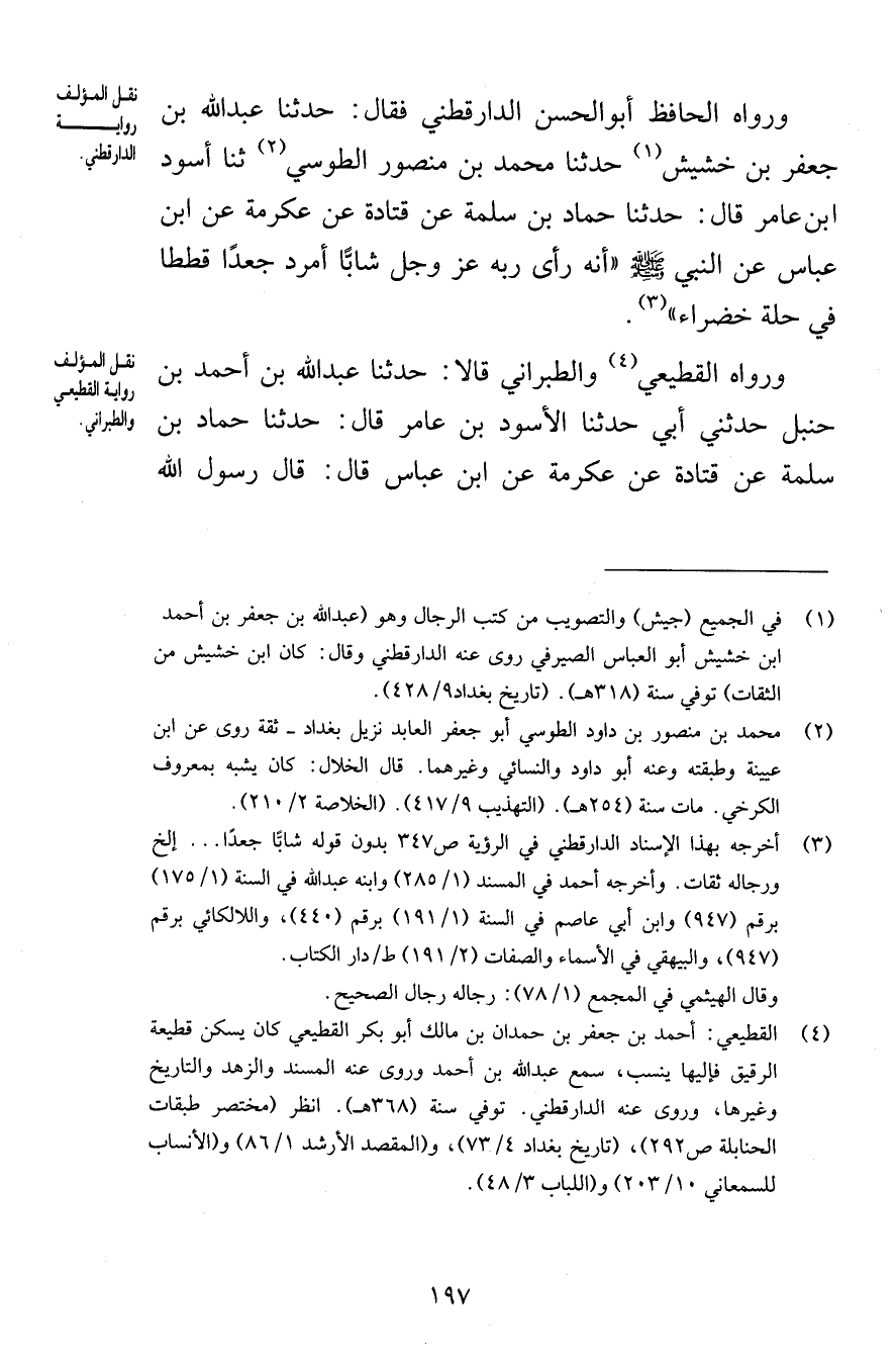 ورواه أبو الحافظ أبوالحسن الدارقطني فقال حدثنا عبد الله بن جعفر بن خشيش حدثنا محمد بن منصور الطوسي ثنا أسود ابن عامر قال حدثنا حماد بن سلمة عن قتادة عن عكرمة عن ابن عباس عن النبي صلى الله عليه وسلم أنه رأى ربه عز وجل شابًّا أمرد جعدًا قططا في حلة خضراء ورواه القطيعي والطبراني قالا حدثنا عبد الله بن أحمد بن حنبل حدثني أبي حدثنا الأسود بن عامر قال حدثنا حماد بن سلمة عن قتادة عن عكرمة عن ابن عباس قال قال رسول الله