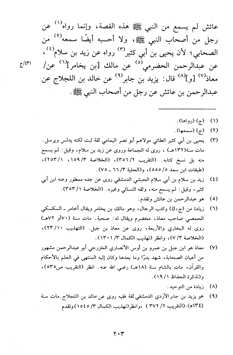 عائش لم يسمع من النبي صلى الله عليه وسلم هذه القصة وإنما رواه عن رجل من أصحاب النبي صلى الله عليه وسلم ولا أحسبه أيضًا سمعه من الصحابي لأن يحيى بن أبي كثير رواه عن زيد بن سلام عن عبد الرحمن الحضرمي عن مالك بن يخامر عن معاذ وقال قال يزيد بن جابر عن خالد بن اللجلاج عن عبد الرحمن بن عائش عن رجل من أصحاب النبي صلى الله عليه وسلم