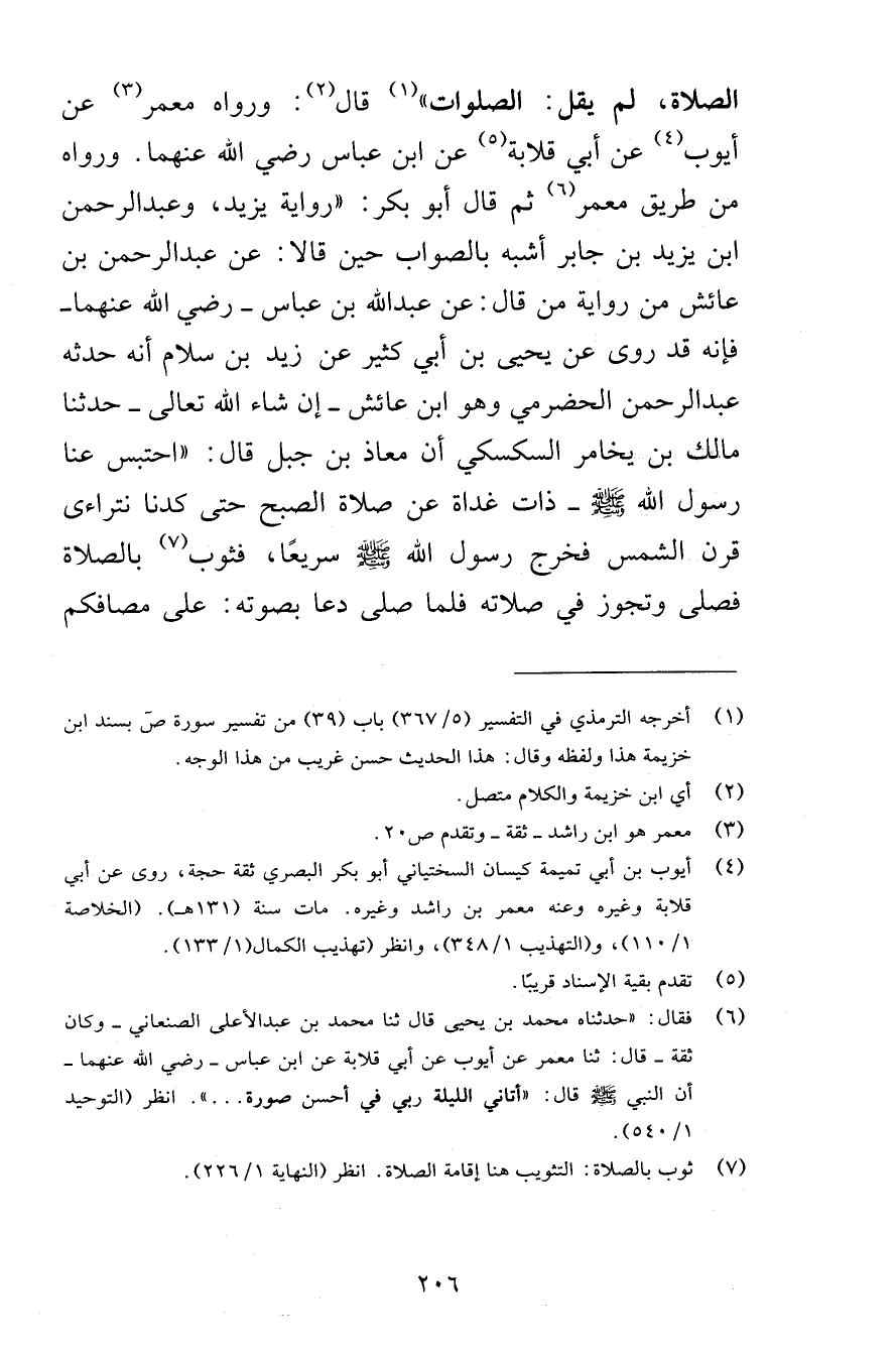 الصلاة لم يقل الصلوات قال ورواه معمر عن أيوب عن أبي قلابة عن ابن عباس رضي الله عنهما ورواه من طريق معمر ثم قال أبو بكر رواية يزيد وعبد الرحمن ابن يزيد بن جابر أسبه بالصواب حين قالا عن عبد الرحمن بن عائش من رواية من قال عن عبد الله بن عباس رضي الله عنهما فإنه قد روى عن يحيى بن أبي كثير عن زيد بن سلام أنه حدثه عبد الرحمن الحضرمي وهو ابن عائش إن شاء الله تعالى حدثنا مالك بن يخامر السكسكي أن معاذ بن جبل قال احتبس عنا رسول الله صلى الله عليه وسلم ذات غداة من صلاة الصبح حتى كدنا نتراءى قرن الشمس فخرج رسول الله صلى الله عليه وسلم سريعًا فثوب بالصلاة فصلى وتجوز في صلاته فلما صلى دعا بصوته على مصافكم