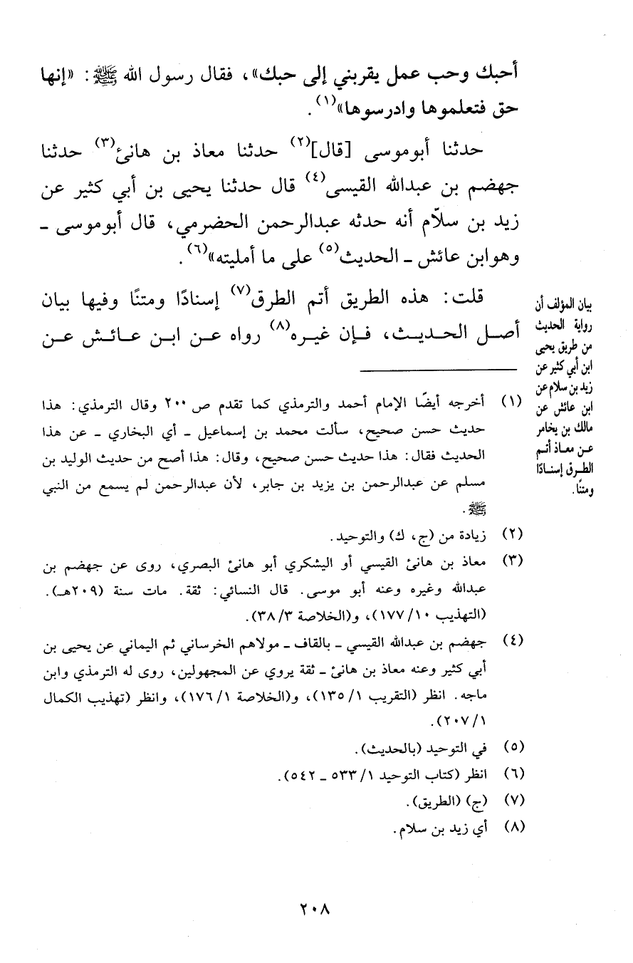 أحبك وحب عمل يقربني إلى حبك فقال رسول الله صلى الله عليه وسلم إنها حق فتعلموها وادرسوها حدثنا أبوموسى قال حدثنا معاذ بن هانئ حدثنا جهضم بن عبد الله القيسى قال حدثنا يحيى بن أبي كثير عن زيد بن سلاّم أنه حدثه عبد الرحمن الحضرمي قال أبوموسى وهو ابن عائش الحديث على ما أمليته قلت هذه الطريق أتم الطرق إسنادًا ومتنًا وفيها بيان أصل الحديث فإن غيره رواه عن ابن عائش عن