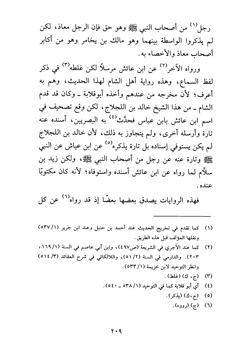 رجل من أصحاب النبي صلى الله عليه وسلم وهو حق فإن الرجل معاذ لكن لم يذكروا الواسطة بينهما وهو مالك بن يخامر وهو من أكابر أصحاب معاذ والأخصاء به ورواه الآخر عن ابن عائش مرسلاً لكن غلطه في ذكر لفظ السماع وهذه رواية أهل الشام بهذا الحديث وهم به أعرف لأن نخرجه من عندهم وأخذه أبوقلابة وكان قد قدم الشام من هذا الشيخ خالد بن اللجلاج لكن وقع تصحيف في اسم ابن عائش بابن عباس فحدَّث به البصريين أسنده عنه تارة وأرساه أخرى ولم يتجاوز به ذلك لأن خالد بن اللجلاج لم يكن يستوفي إسناده بل تارة يذكره عن ابن عياش عن النبي صلى الله عليه وسلم وتارة عنه عن رجل من أصحاب النبي صلى الله عليه وسلم ولكن زيد بن سلاّم لما رواه عن ابن عائش أسنده واستوفاه لأنه كان مكتوبًا عنده فهذه الروايات يصدق بعضه بعضًا إذ قد رواه عن كل