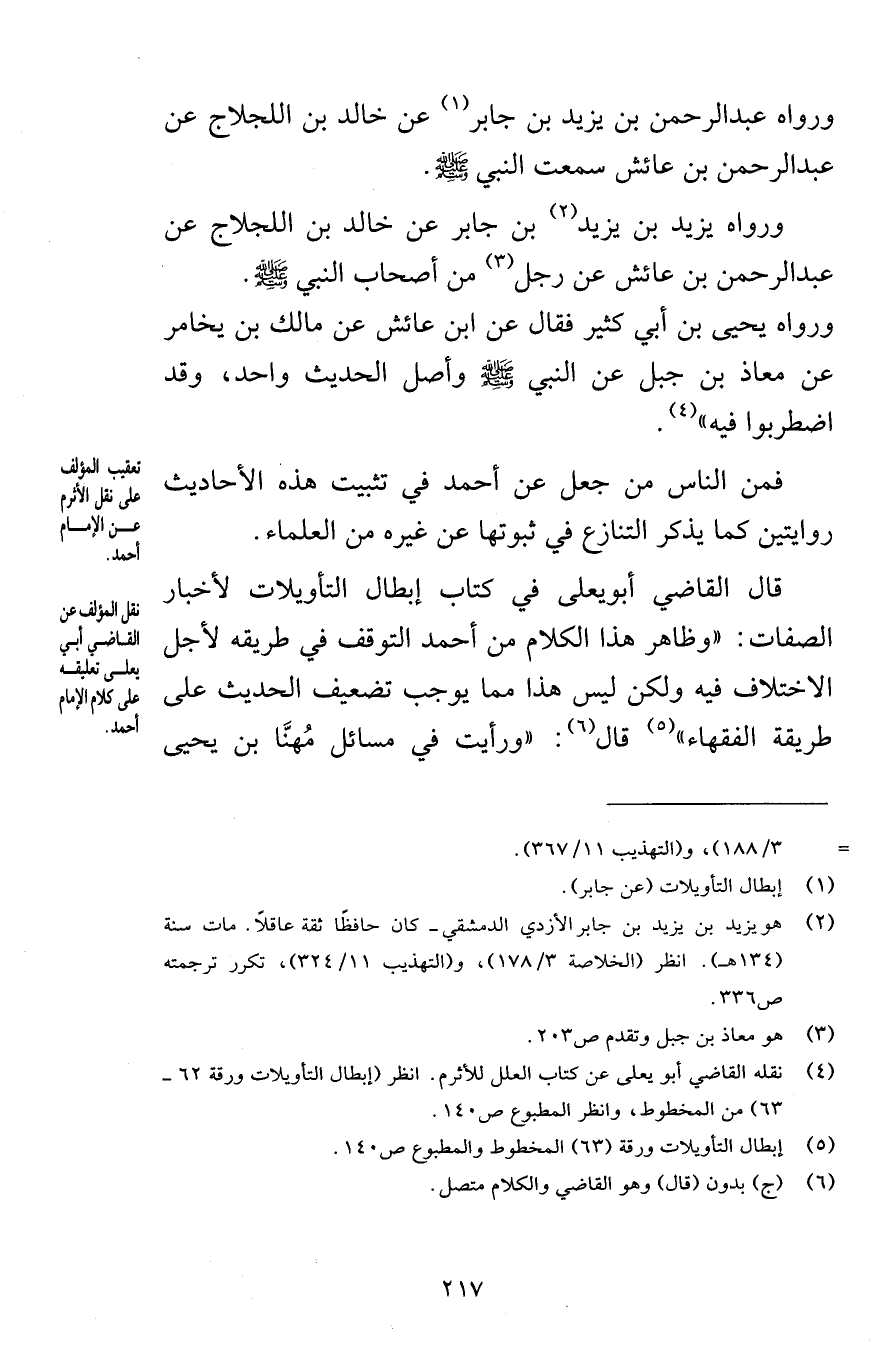 ورواه عبد الرحمن بن يزيد بن جابر عن خالد بن اللجلاج عن عبد الرحمن بن عائش سمعت النبي صلى الله عليه وسلم ورواه يزيد بن يزيد بن جابر عن خالد بن اللجلاج عن عبد الرحمن بن عائش عن رجل من أصحاب النبي صلى الله عليه وسلم ورواه يحيى بن أبي كثير فقال عن ابن عائش عن مالك بن يخامر عن معاذ بن جبل عن النبي صلى الله عليه وسلم وأصل الحديث واحد وقد اضطربوا فيه فمن الناس من جعل عن أحمد في تثبيت هذه الأحاديث روايتين كما يذكر التنازع في ثبوتها عن غيره من العلماء قال القاضي أبويعلى في كتاب إبطال التأويلات لأخبار الصفات وظاهر هذا الكلام من أحمد التوقف في طريقه لأجل الاختلاف فيه ولكن ليس هذا مما يوجب تضعيف الحديث على طريقة الفقهاء قال ورأيت في مسائل مُهنَّا بن يحيى
