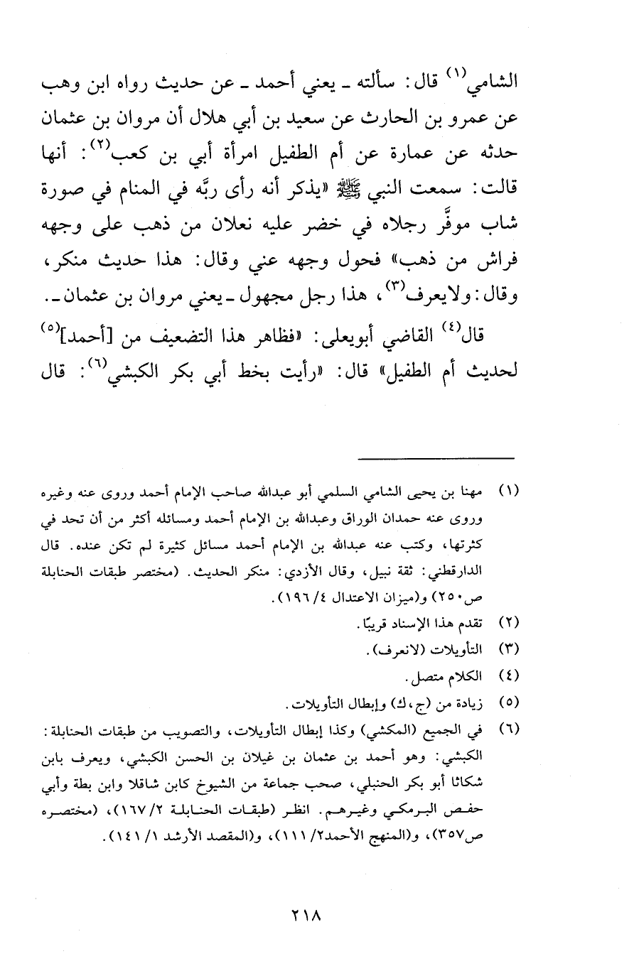 الشامي قال سألته يعني أحمد عن حديث رواه ابن وهب عن عمرو بن الحارث عن سعيد بن أبي هلال أن مروان بن عثمان حدثه عن عمارة عن أم الطفيل امرأة أبي بن كعب أنها قالت سمعت النبي صلى الله عليه وسلم يذكر أنه رأى ربَّه في المنام في صورة شاب موفَّر رجلاه في خضر عليه نعلان من ذهب على وجهه فراش من ذهب فحول وجهه عني وقال هذا حديث منكر وقال ولايعرف هذا رجل مجهول يعني مروان بن عثمان قال القاضي أبويعلى فظاهر هذا التضعيف من أحمد لحديث أم الطفيل قال رأيت بخط أبي بكر الكبشي قال